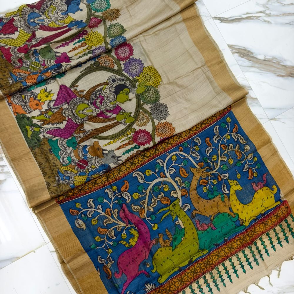 Discover the timeless elegance of this exquisite Gicha Tussar Silk Saree, adorned with intricate hand-painted Madhubani artwork. The saree features a harmonious blend of tradition and artistry, showcasing the rich heritage of Indian craftsmanship.