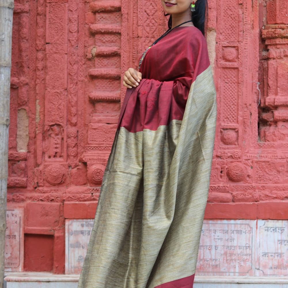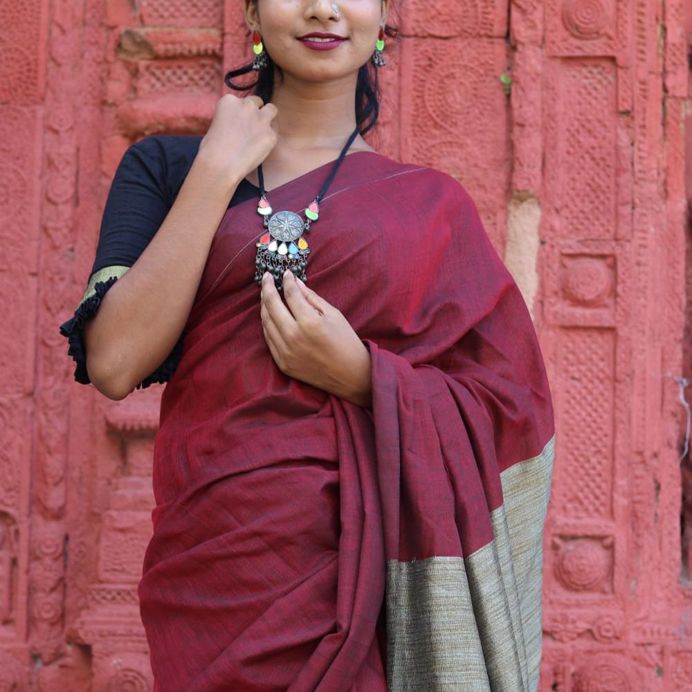 Elevate your wardrobe with this timeless maroon saree, accentuated by a bold maroon aanchal. The plain maroon body exudes sophistication and charm, while the golden aanchal creates a striking contrast, making it perfect for formal occasions, festive celebrations, or everyday elegance. Handwoven with care, this saree is soft, breathable, and designed to ensure comfort throughout the day.