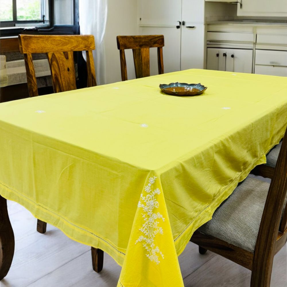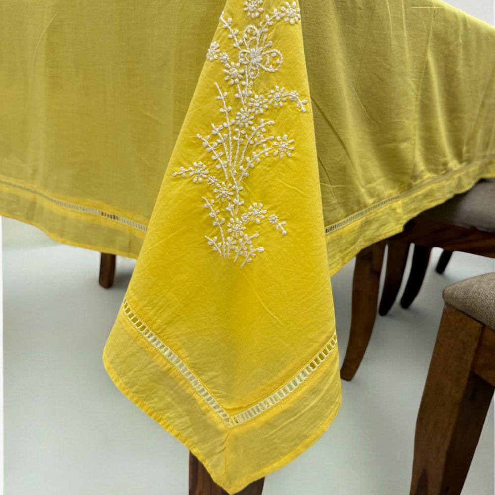 Brighten up your dining space with this stunning 100% handloom table runner, made from 100% pure cotton in a vibrant mustard yellow hue. Featuring elegant Chikankari embroidery, a traditional hand-embroidery art from Uttar Pradesh, India, this runner is adorned with delicate floral motifs in a soft ivory tone.