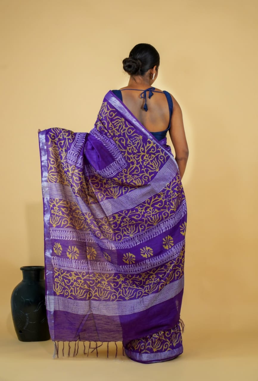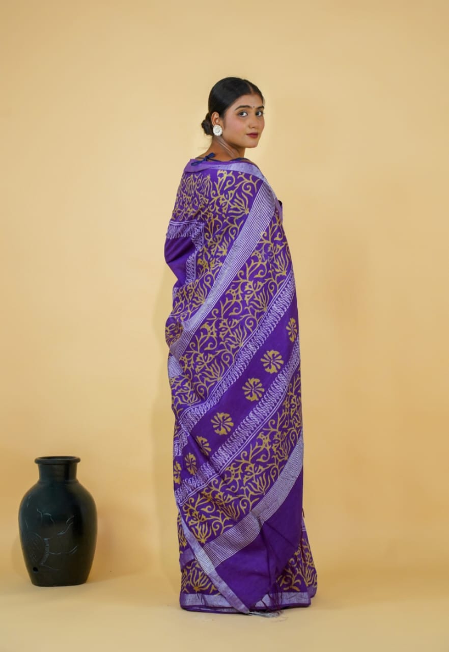 This saree is a perfect blend of traditional elegance and everyday comfort, making it ideal for festive celebrations, cultural events, or casual outings. The vibrant purple tone paired with the artistic Batik print ensures you radiate grace and individuality wherever you go.