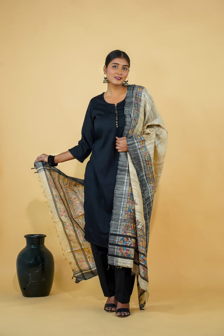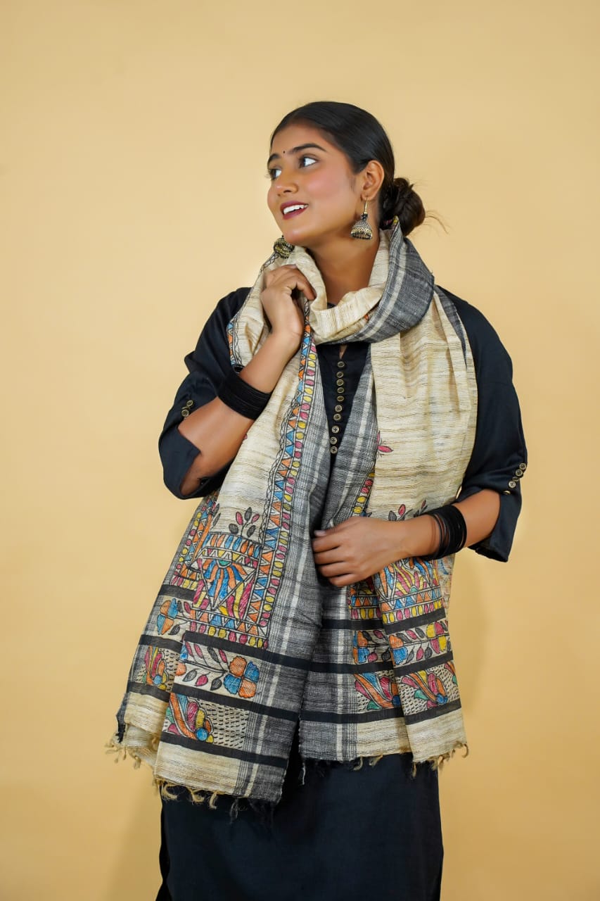 Bring home a piece of living heritage with this exquisite Beige Colour Ghicha Silk Dupatta, beautifully hand-painted in the timeless Madhubani art form. Each piece reflects traditional storytelling and skilled craftsmanship — making it not just an accessory, but a work of art.
