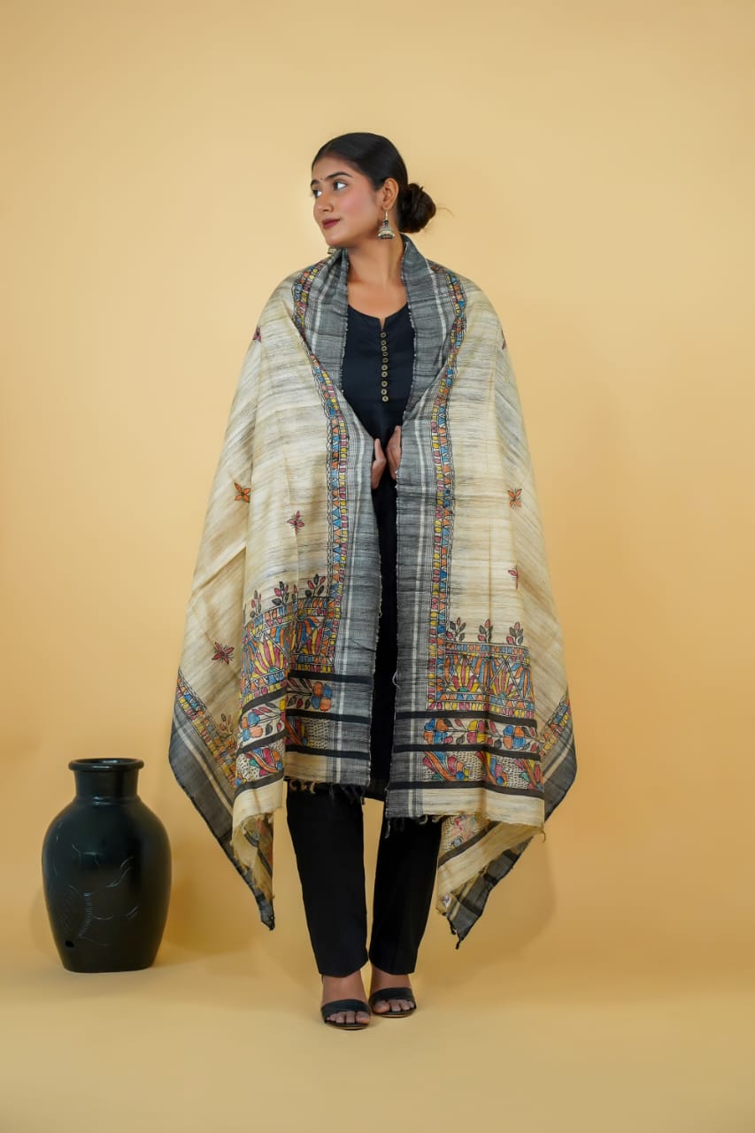 Beige Colour Madhubani Painting Ghicha Silk Dupatta | Handcrafted on Pure Silk
