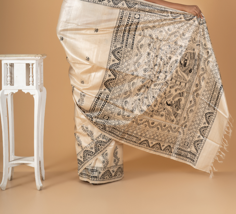 Beige Madhubani Tussar Silk Saree –Vanita Vihar Theme