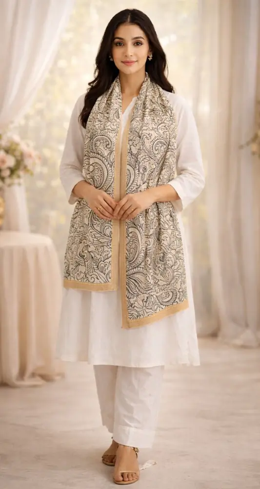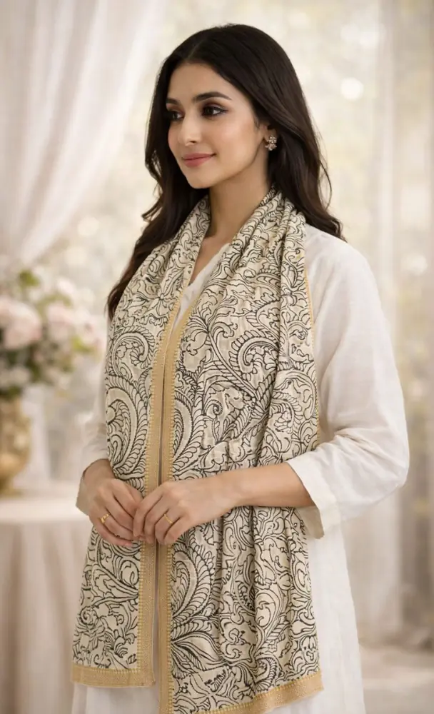 Immerse yourself in the beauty of tradition with this elegant Bangalore silk dupatta, showcasing intricate black motifs on a pristine cream base. This 2.5-meter long masterpiece features detailed designs, including floral patterns and central figurative art, exuding a timeless charm. The golden border adds a subtle shimmer, elevating its luxurious appeal.