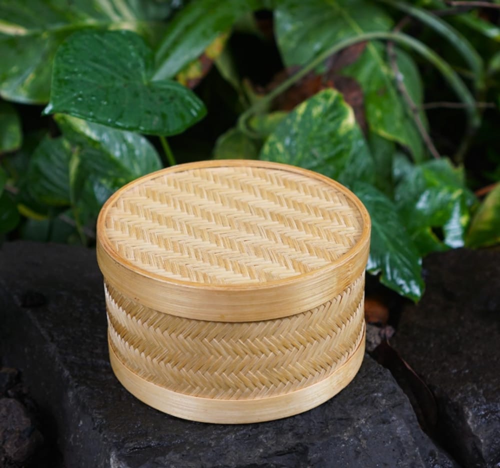 Bring home the elegance of traditional craftsmanship with this handwoven bamboo round storage box. Made by skilled artisans, this eco-friendly box features a fine herringbone weave that highlights the natural beauty of bamboo. Sturdy yet lightweight, it is perfect for storing dry fruits, jewelry, spices, small accessories, or even for use as a decorative gift box. Its natural finish blends seamlessly with any décor, making it both functional and stylish.