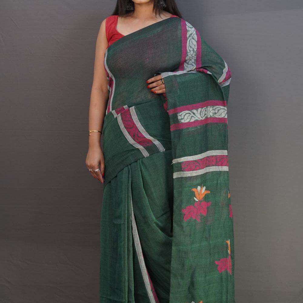 Embrace the charm of traditional craftsmanship with our Elegant Linen Jamdani Saree in a serene green hue. Handwoven from the finest linen, this saree offers a perfect blend of comfort and elegance. Adorned with intricate floral motifs in vibrant shades of pink, orange, and white, this saree reflects the timeless beauty of the Jamdani weaving tradition.