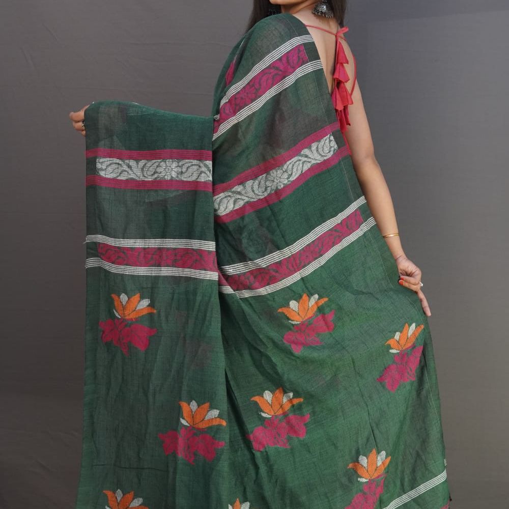 Add a touch of elegance to your wardrobe with this Elegant Linen Jamdani Saree in green, a harmonious blend of tradition and contemporary fashion.