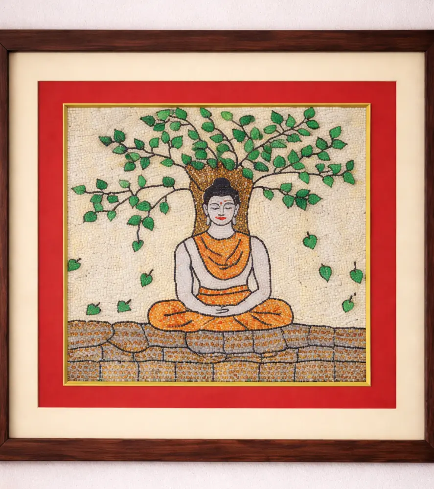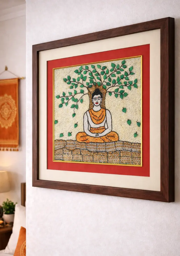 This framed Sujani painting is handcrafted by artisans from Bihar using traditional embroidery techniques. Depicting a meditative figure seated under a flourishing Bodhi tree, it symbolizes enlightenment, inner peace, and spiritual awakening. Each piece is intricately hand-stitched on fabric and framed, blending heritage craftsmanship with serene home décor.