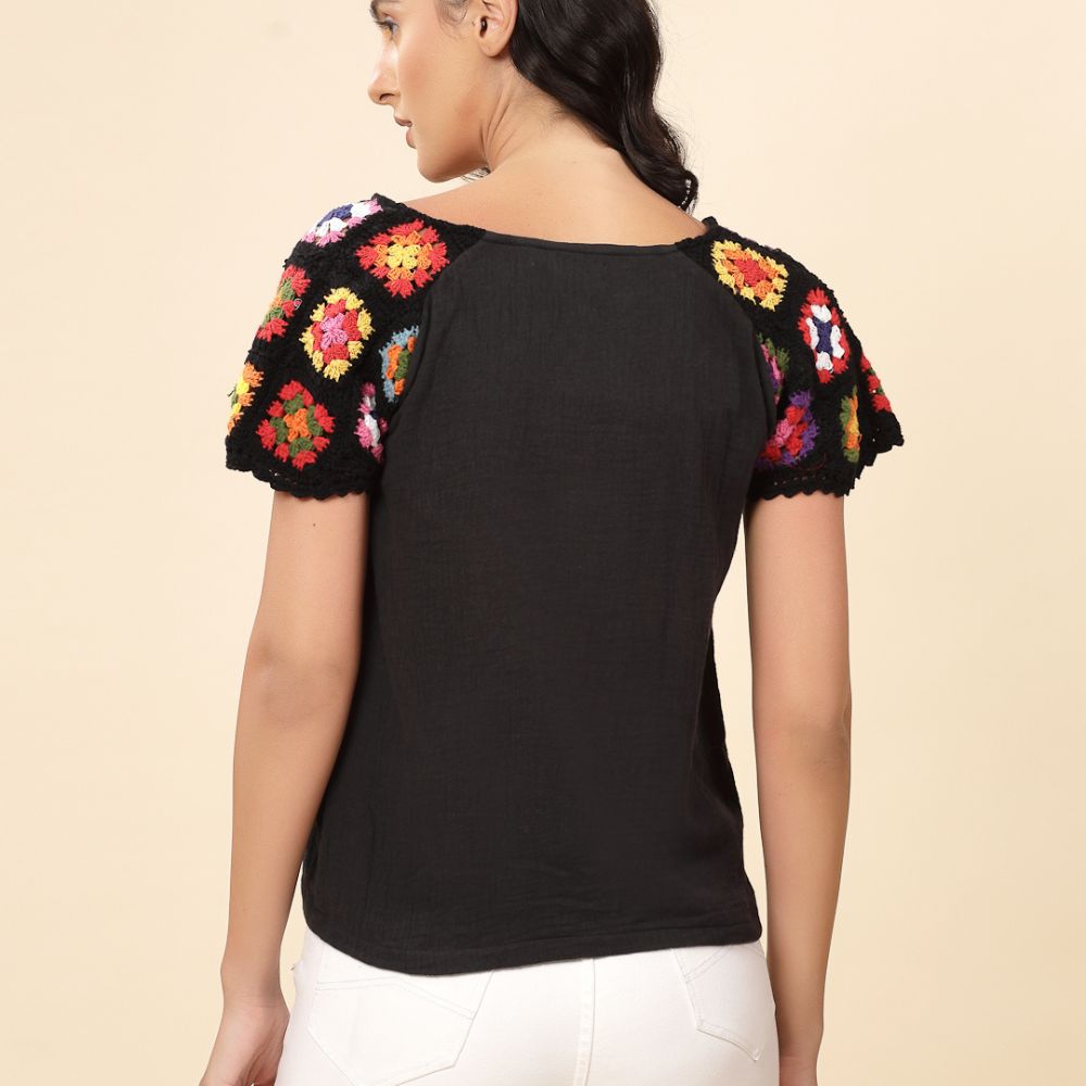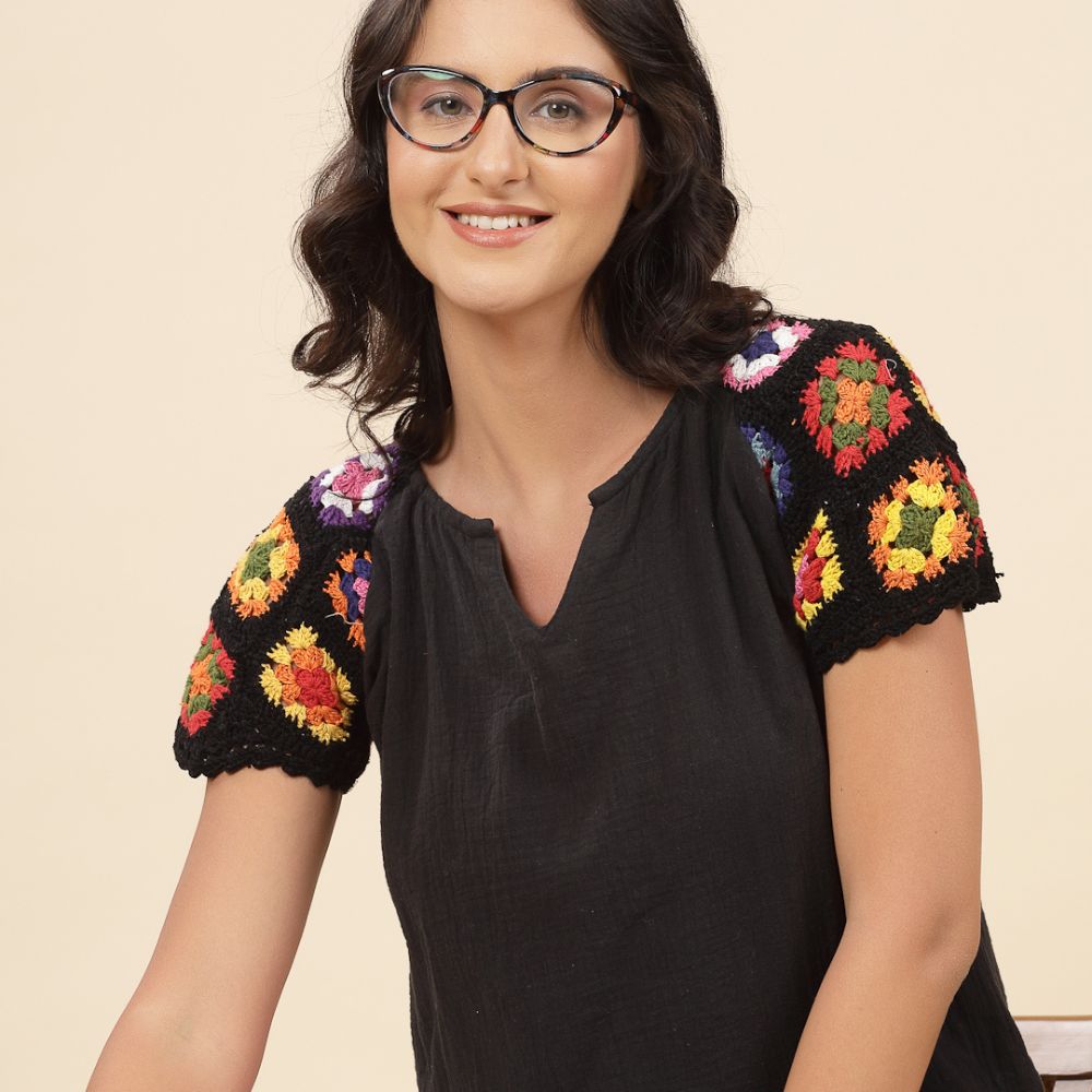 Infuse your everyday style with a splash of color and craftsmanship with this boho-inspired black top featuring hand-crocheted multicolor sleeves. The vibrant crochet granny-square patches, stitched onto both sleeves, celebrate artisanal handiwork and joyful expression. Set against a solid black cotton base, the multicolor floral motifs truly stand out—perfect for those who love a subtle statement.