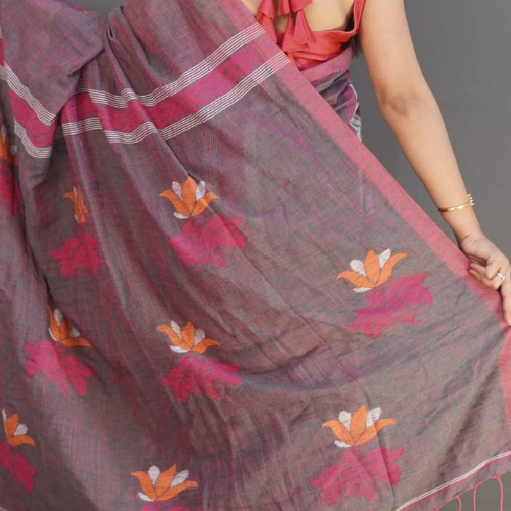 Experience the fusion of tradition and modern elegance with our Elegant Linen Jamdani Saree. This handcrafted masterpiece is woven from premium linen, offering a lightweight and breathable drape perfect for any season. The saree features exquisite floral motifs in vibrant shades of pink, orange, and white, intricately woven using the traditional Jamdani technique, making each piece a true work of art.