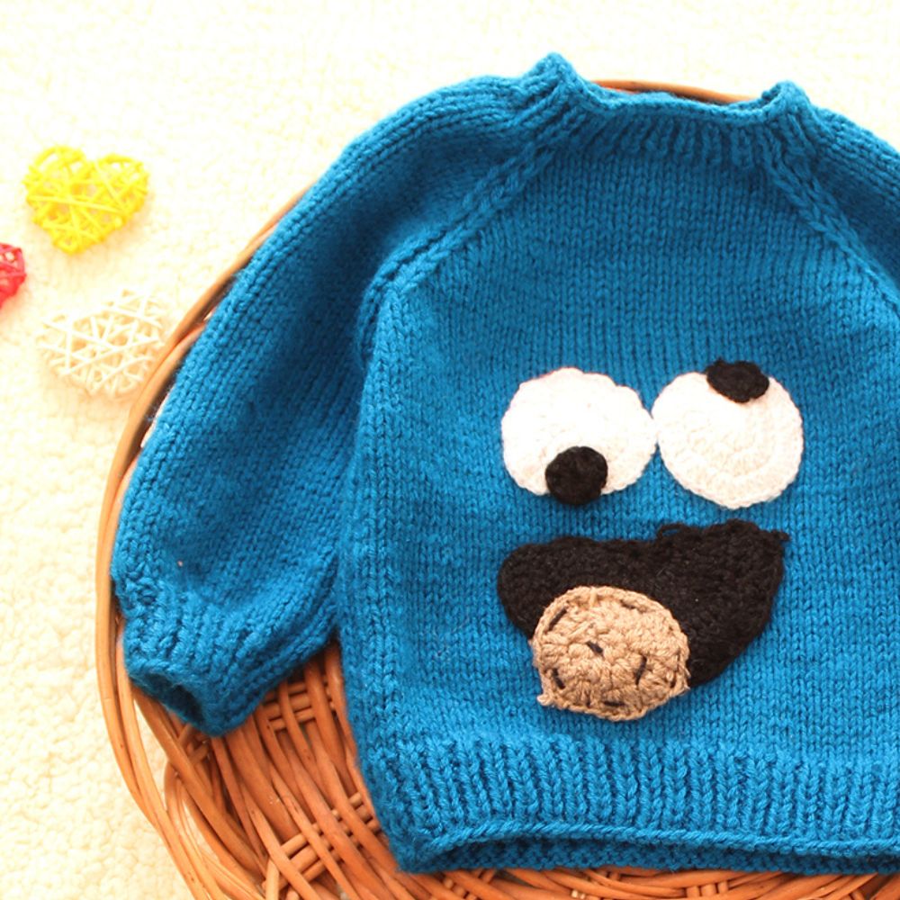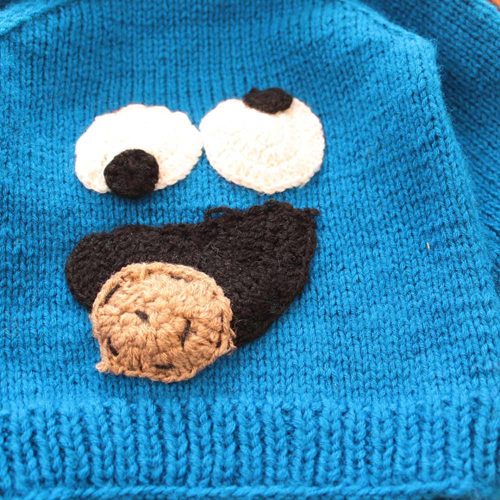 The sweater appears to be made of a knitted fabric, likely wool or a wool blend, given its textured look and shape-holding properties.The front of the sweater features a prominent character face, resembling the Cookie Monster from Sesame Street. The character has large white eyes with black pupils and a black mouth with a brown cookie.
