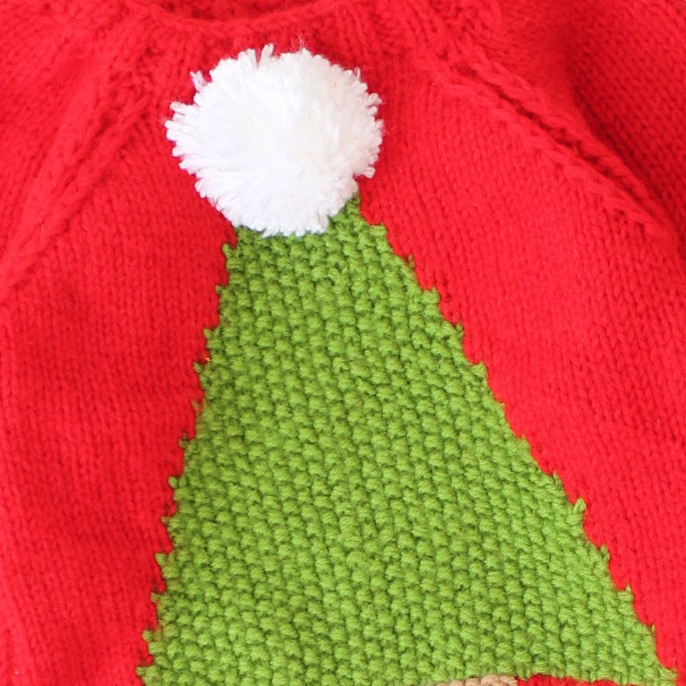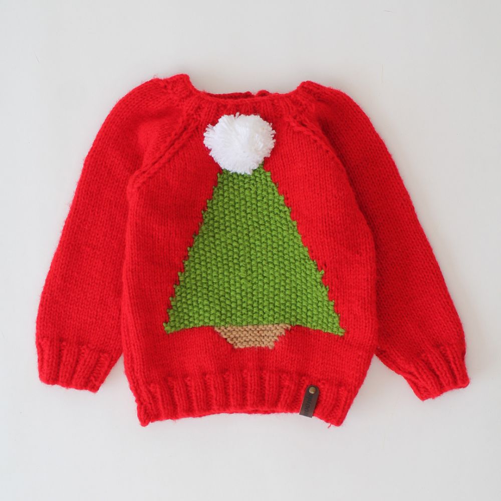 The sweater appears to be made of a textured knit fabric, likely wool or a wool blend. This choice of material provides warmth and comfort.The sweater features a festive Christmas tree design. The tree is centered on the front and is adorned with a white pom-pom at the top, mimicking snow or a tree topper. The brown trunk adds a touch of realism. Color: The primary color of the sweater is a vibrant red. Perfect for spreading holiday cheer.