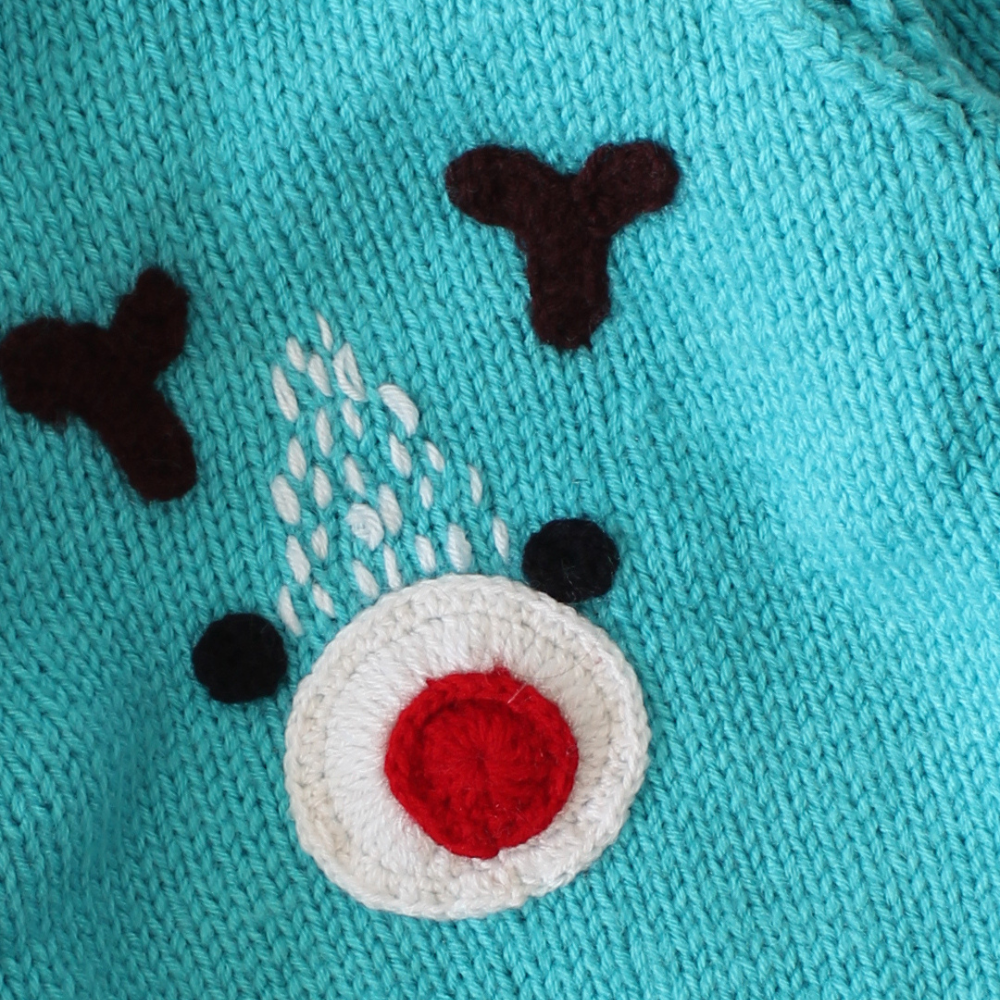 The sweater appears to be knitted with ribbed cuffs at the wrists and waist for added texture. It features an intricate design resembling the face of a Beer complete with antlers. The antlers are in black and white while the eyes are black with white highlights. Right at the center there’s a red nose reminiscent of Rudolph the Red Nosed Reindeer. Overall Impression It’s a playful and whimsical piece perfect for chilly days.