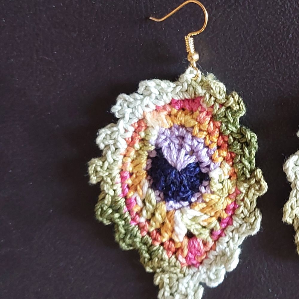 These multicolor crochet earrings are a vibrant and eye-catching accessory for any wardrobe. The intricate design, resembling a peacock feather, features a beautiful combination of soft greens, blues, pinks, and purples, blending together in a stunning layered pattern. Each earring is handmade with care, using premium-quality yarn to ensure both comfort and durability.