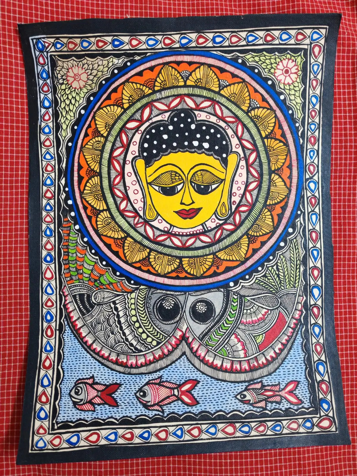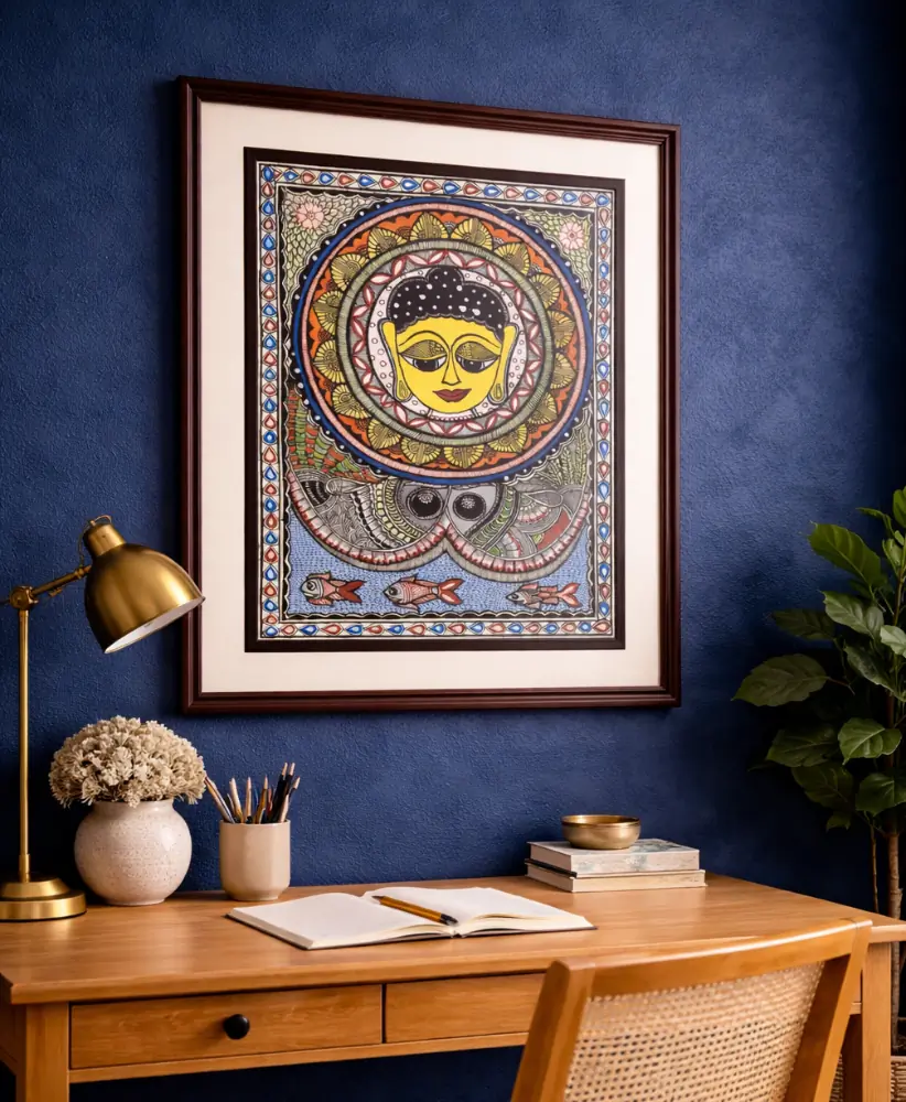 A serene handcrafted Madhubani painting featuring a divine Buddha mandala motif that brings peace, balance, and spiritual elegance to your décor.