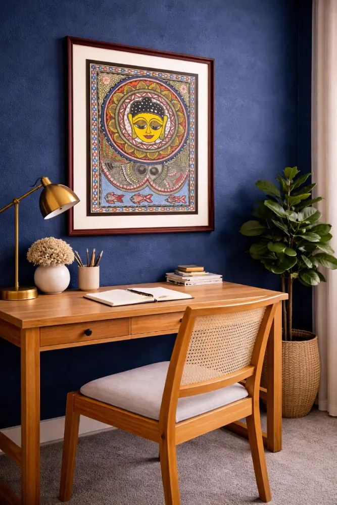 This soulful Madhubani painting is hand-illustrated by traditional folk artisans using intricate detailing and heritage colour techniques. The calm Buddha face within a decorative mandala symbolizes inner peace, wisdom, and spiritual harmony. Ideal for study areas, meditation corners, or living spaces, it enhances cultural aesthetics and mindful ambience.