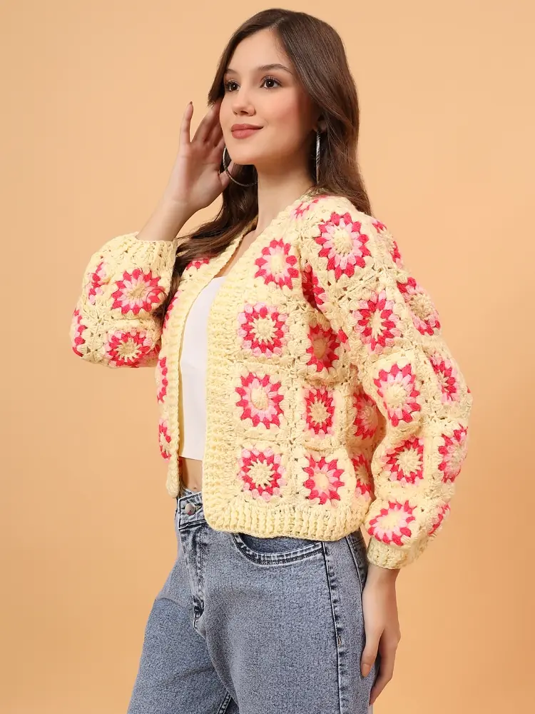 A soft buttercream crochet sweater adorned with handcrafted pink floral motifs for a cheerful, artisanal look.