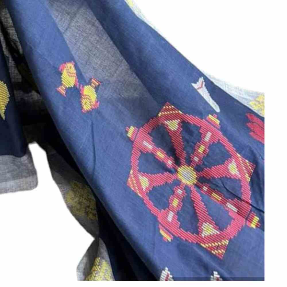 The Celestial Harmony Bawan Buti Saree is a breathtaking representation of Indian artistry, intricately handwoven by skilled artisans from Bihar. This exquisite saree features a deep dark blue base adorned with a harmonious blend of motifs, including fish, shankh (conch shell), flowers, chakra (wheel), and lotus in the aachal. Each symbol carries profound significance, representing abundance, spirituality, and purity, making this saree a meaningful addition to your wardrobe.