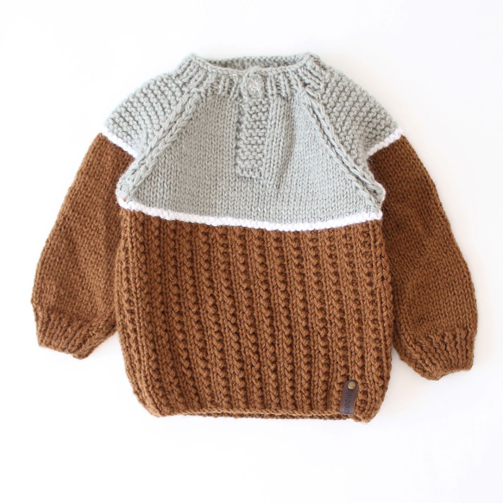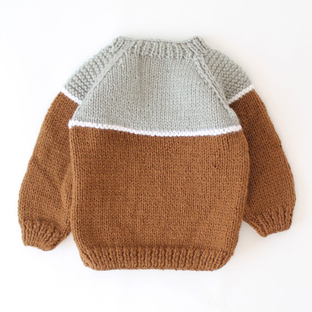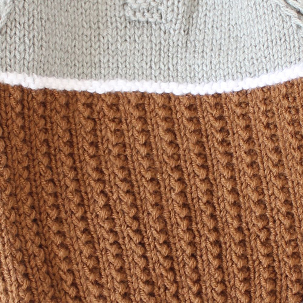 Pattern: The knit pattern includes vertical ribbing in the brown section and a smooth stockinette stitch in the gray section.