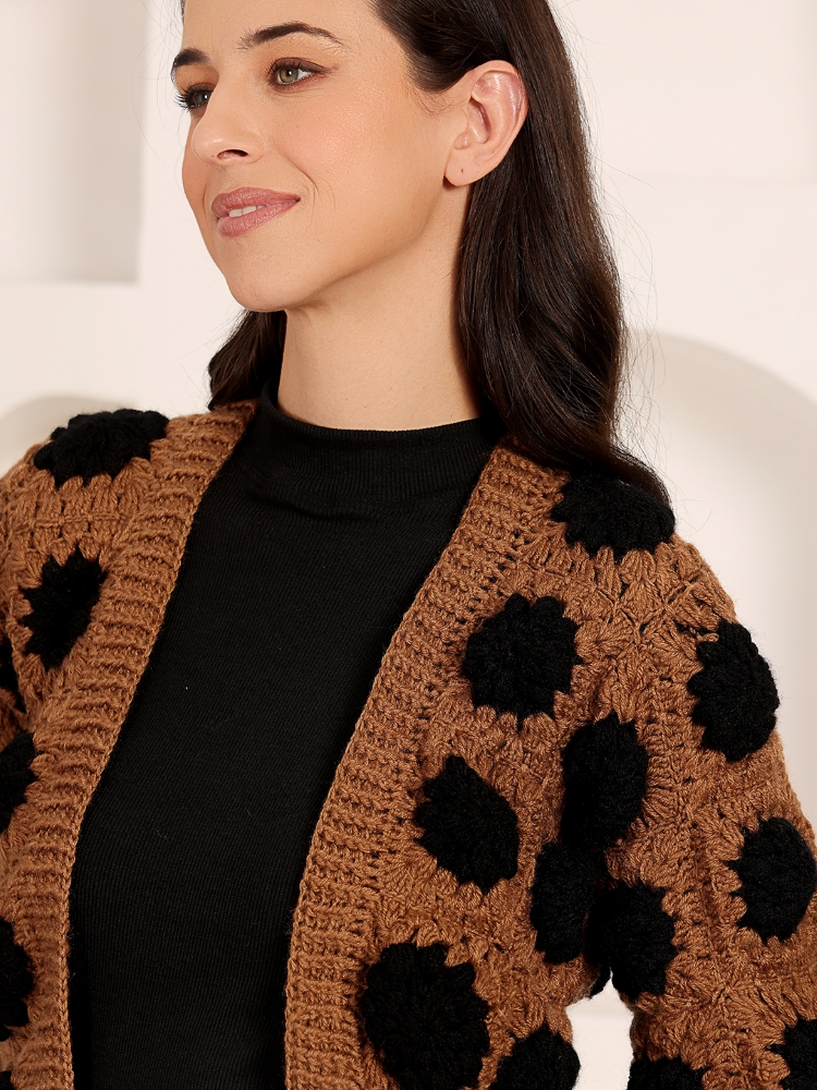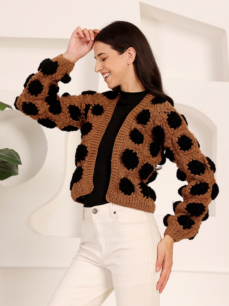 A statement hand-crocheted brown cardigan accented with bold black polka motifs, crafted for cozy warmth and modern artisanal style.