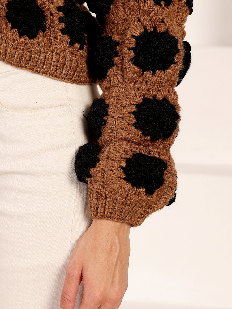 This hand-crocheted cardigan sweater is meticulously crafted by skilled artisans using traditional crochet techniques. The rich cocoa-brown base is highlighted with textured black polka motifs, creating a striking contrast with a contemporary feel. Warm yet breathable, this cardigan is perfect for winter layering and elegant everyday styling.