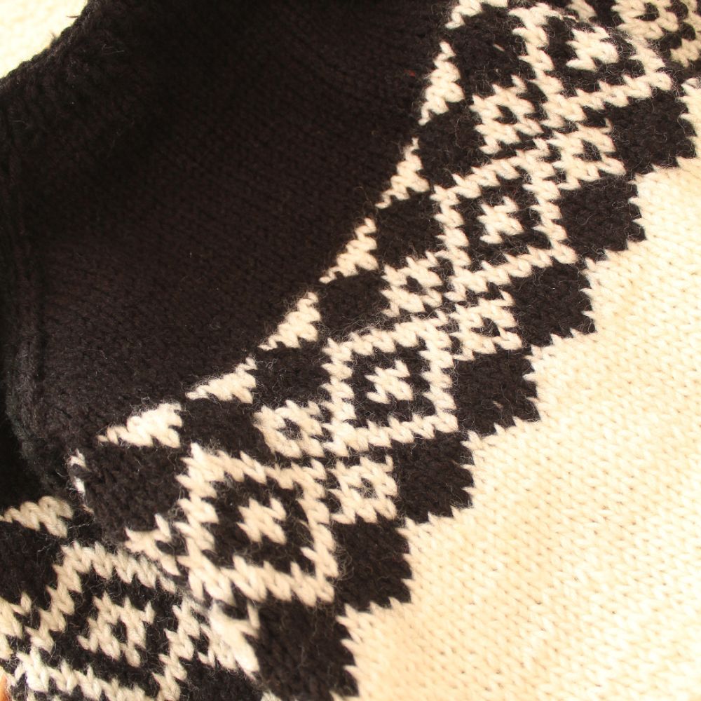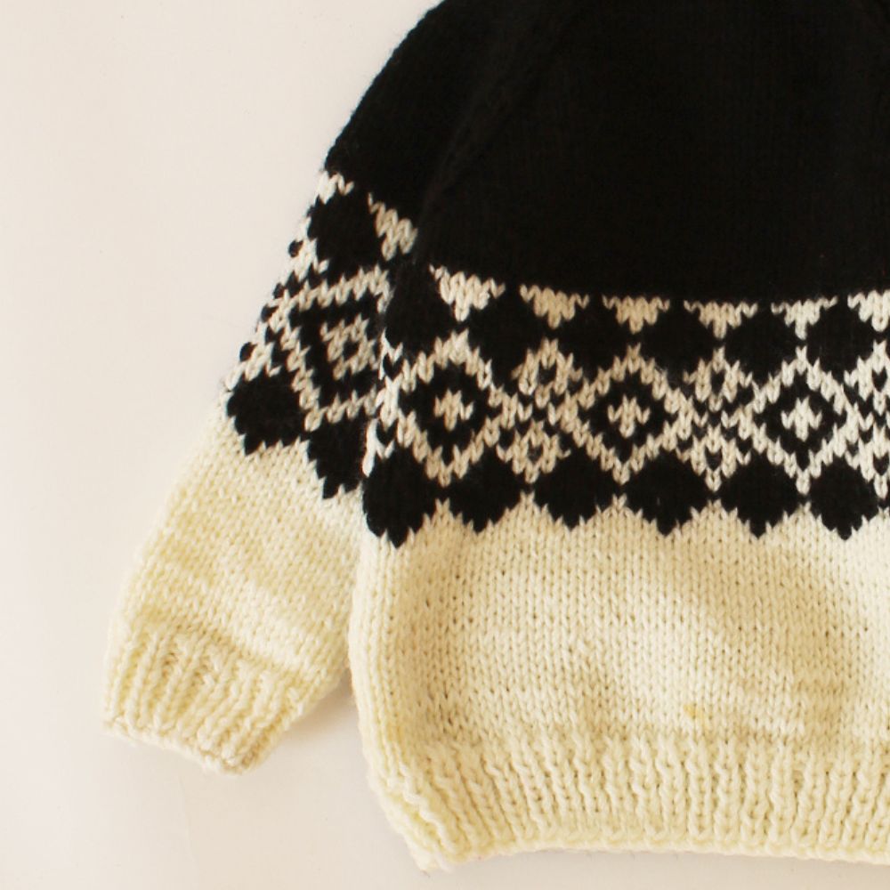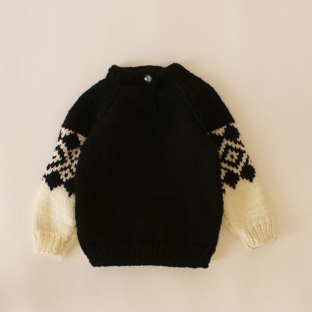 This cozy sweater features a color-block design with the upper part in black and the lower part in cream. The chest area showcases a unique pattern of black and cream geometric shapes, reminiscent of traditional or folk motifs.