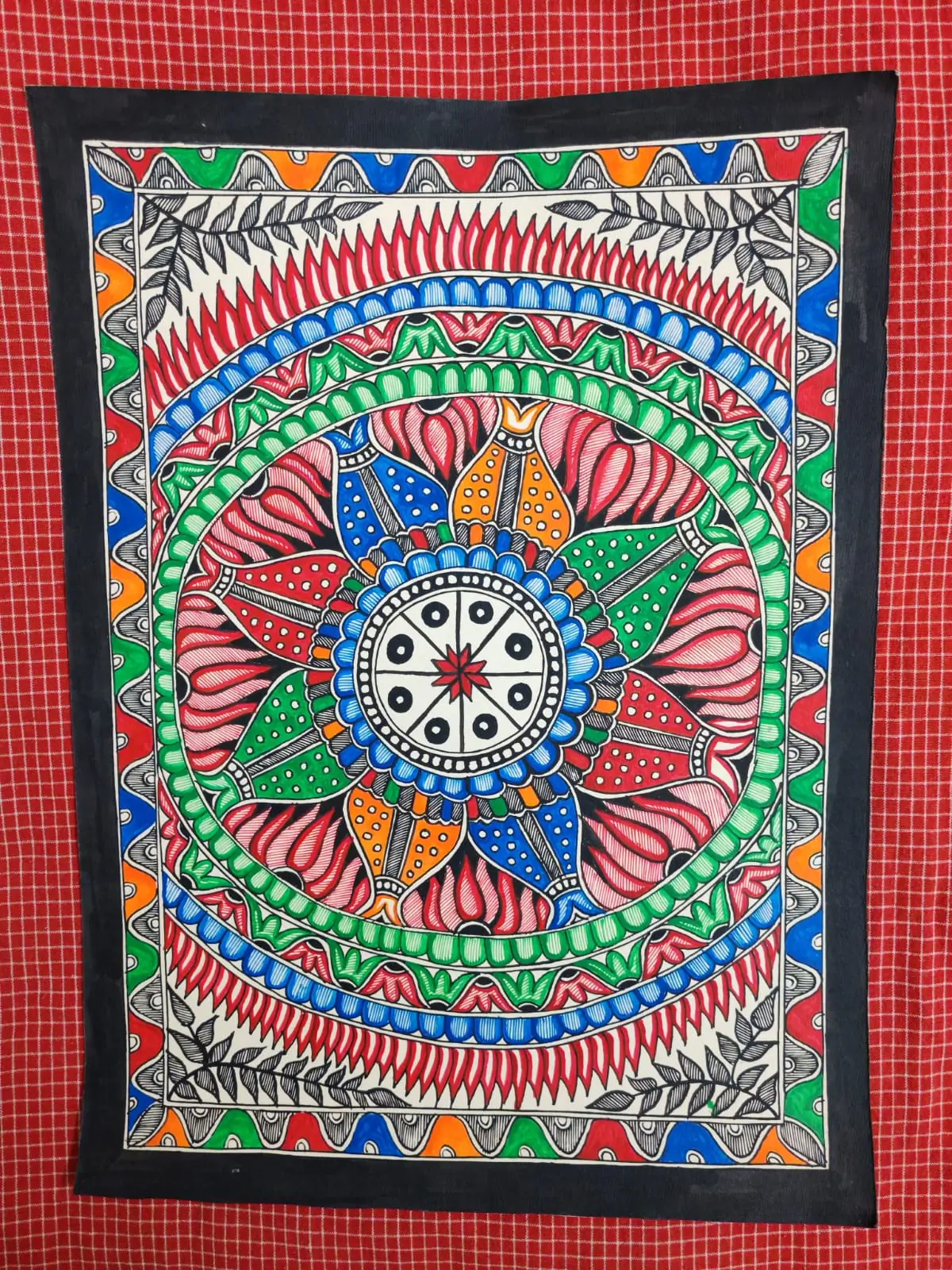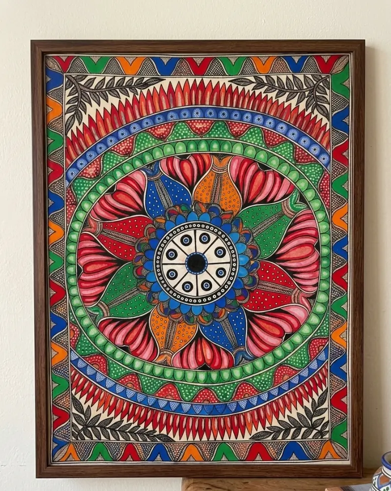 A vibrant handcrafted Madhubani mandala painting that radiates harmony, cultural richness, and artistic elegance.