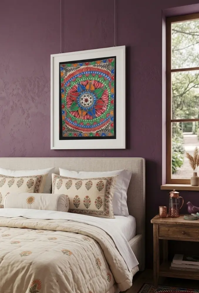 This exquisite Madhubani painting is hand-drawn by traditional folk artisans using intricate linework and natural colour techniques. The symmetrical mandala pattern symbolizes balance, unity, and spiritual harmony, making it perfect for bedroom décor, meditation spaces, or living areas. Each artwork is carefully created to reflect authentic craftsmanship and timeless folk artistry.