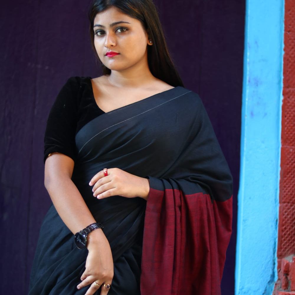 This timeless black saree with a contrasting maroon aanchal is a perfect blend of sophistication and elegance. Its plain black body creates a sleek and graceful silhouette, while the deep maroon aanchal adds a striking touch, making it suitable for formal events, casual outings, or festive occasions. Crafted from handwoven cotton, it is soft, breathable, and lightweight for comfortable wear throughout the day.