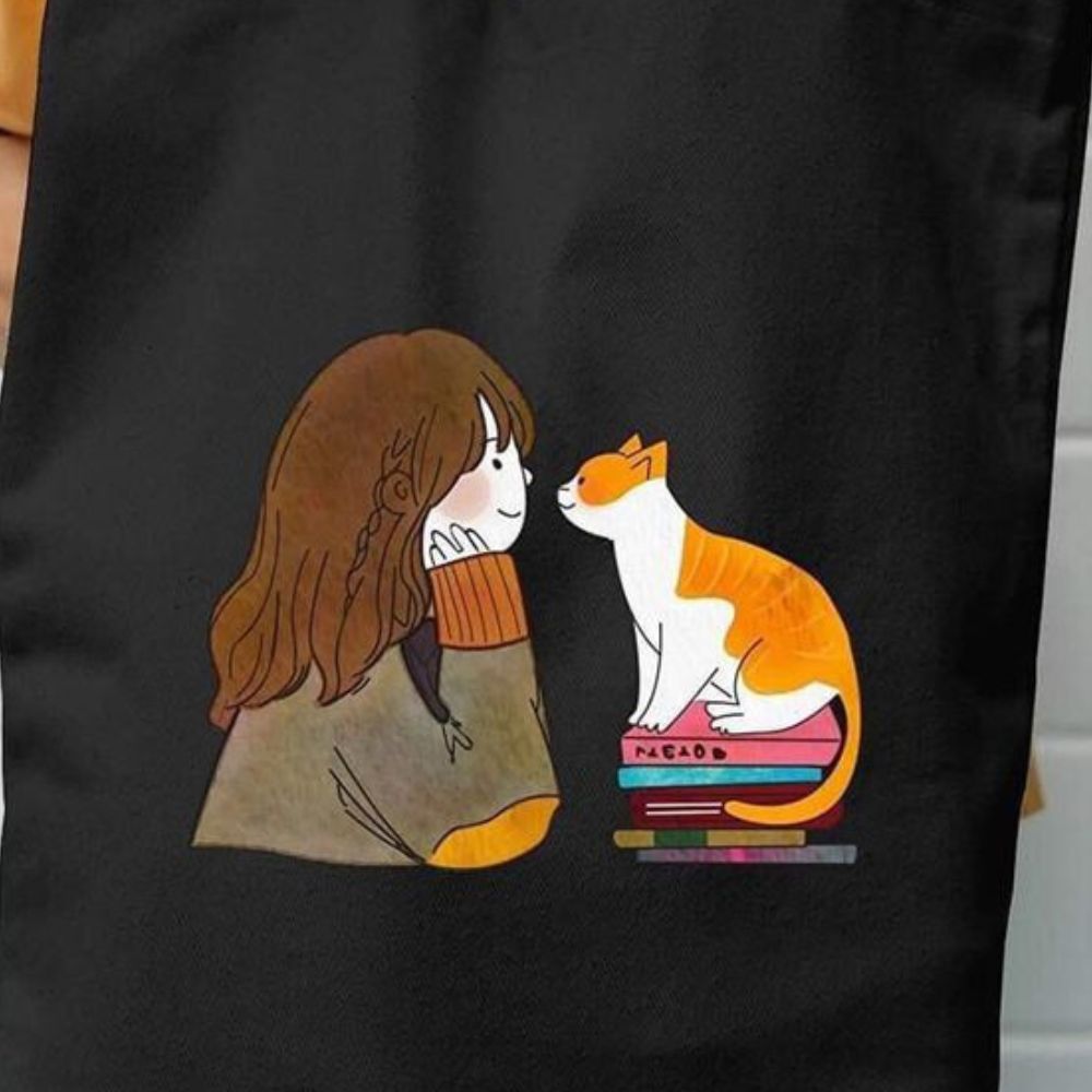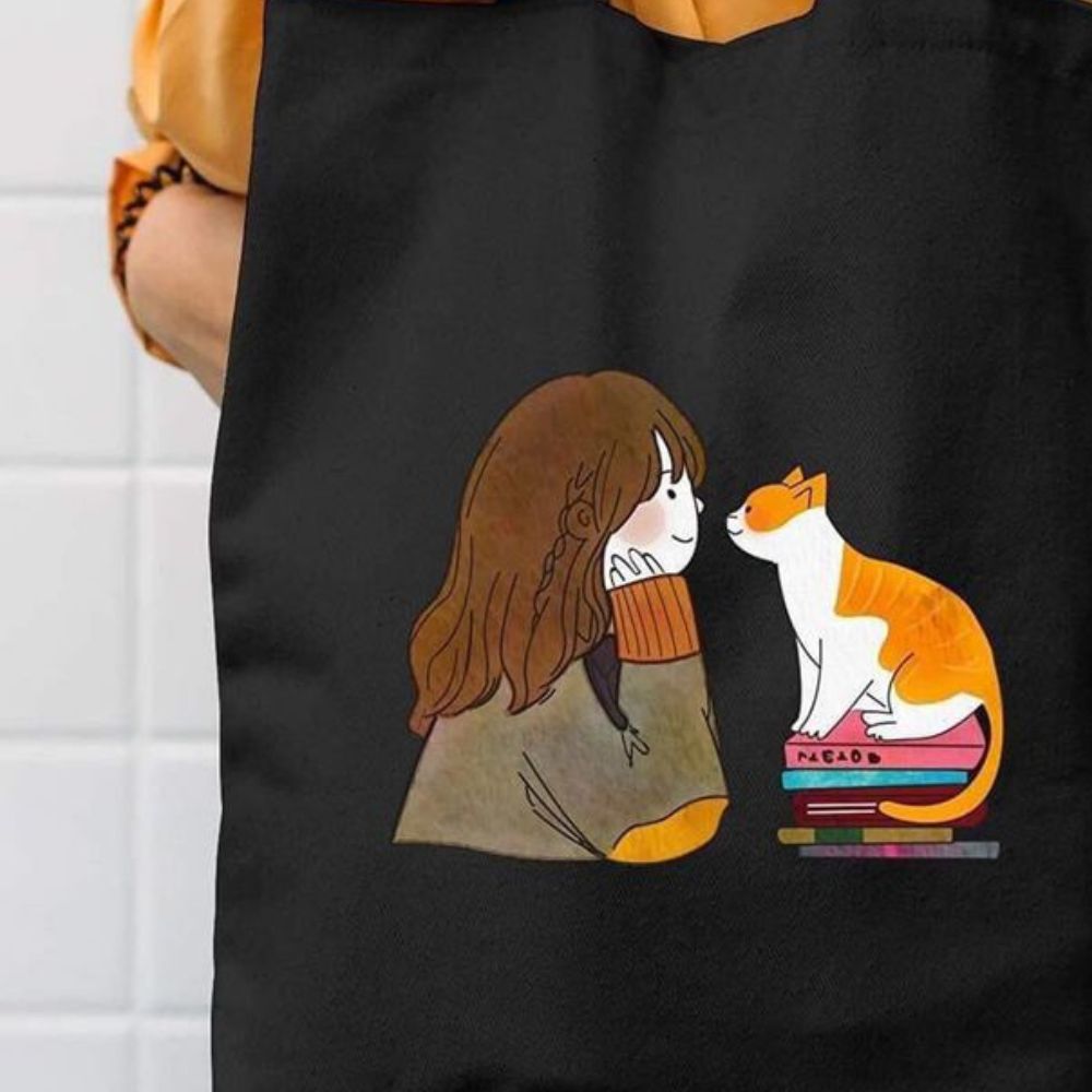 whimsy to your day with this Cozy Moments Cat & Girl Illustration Tote Bag. Featuring a charming design of a girl gazing lovingly at her feline friend, this black canvas bag is perfect for cat lovers and art enthusiasts. Made from durable, high-quality cotton, it's spacious enough for your daily essentials, making it ideal for shopping, school, or casual outings. The delightful print adds a playful vibe, making this tote bag not only practical but also a stylish accessory for every day.