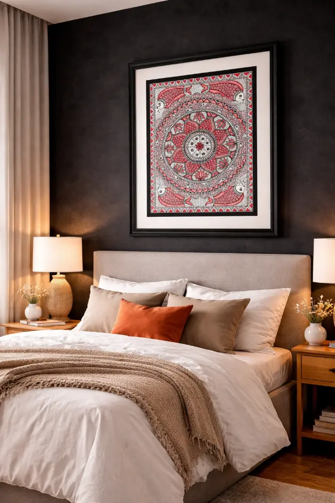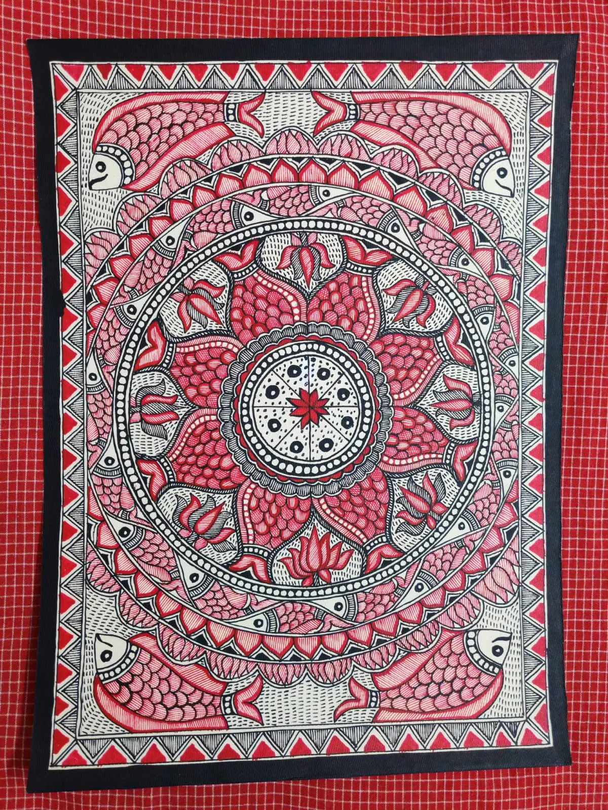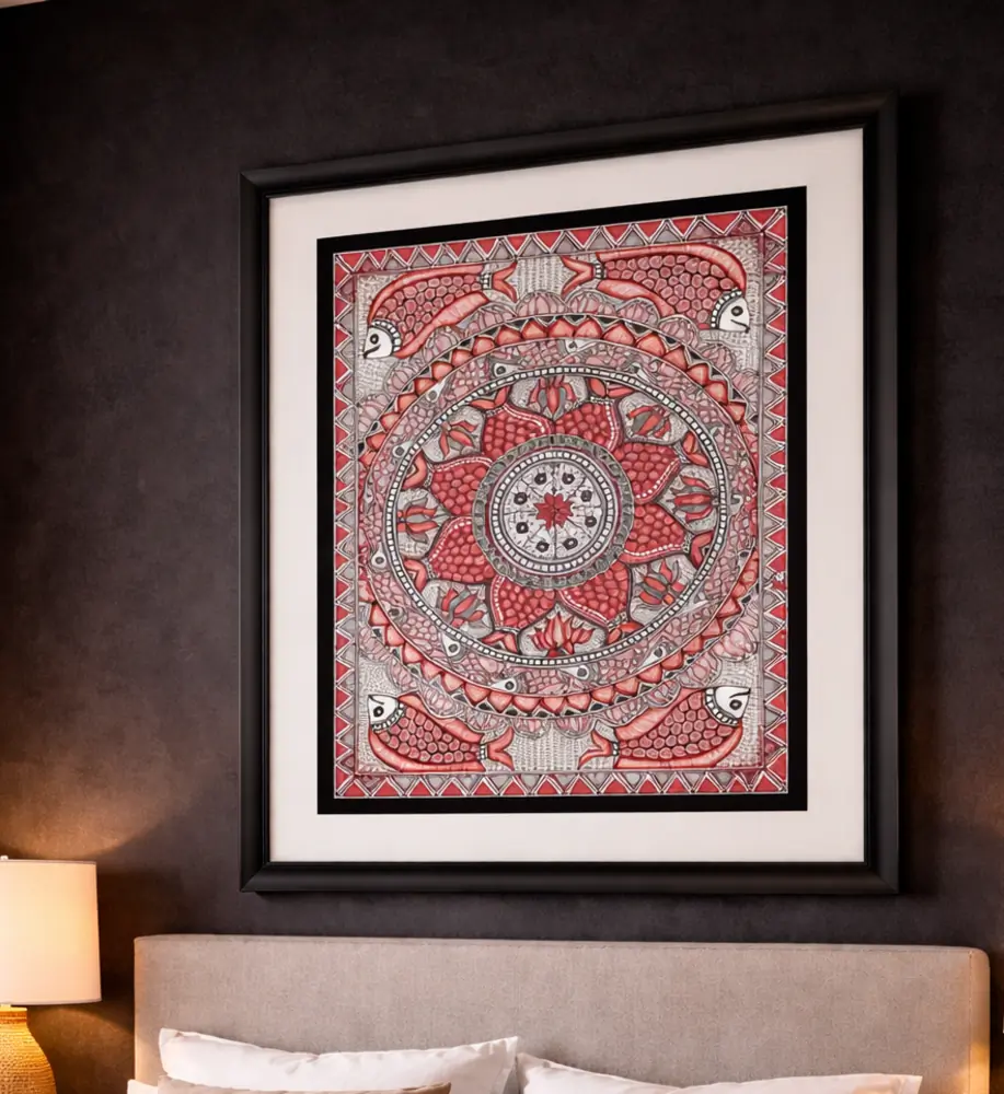 This elegant Madhubani painting showcases a striking circular mandala in deep crimson tones, enriched with fish motifs and intricate geometric detailing. Rooted in Mithila tradition, it reflects abundance, balance, and continuity of life. The bold color palette makes it a perfect statement piece for modern interiors.