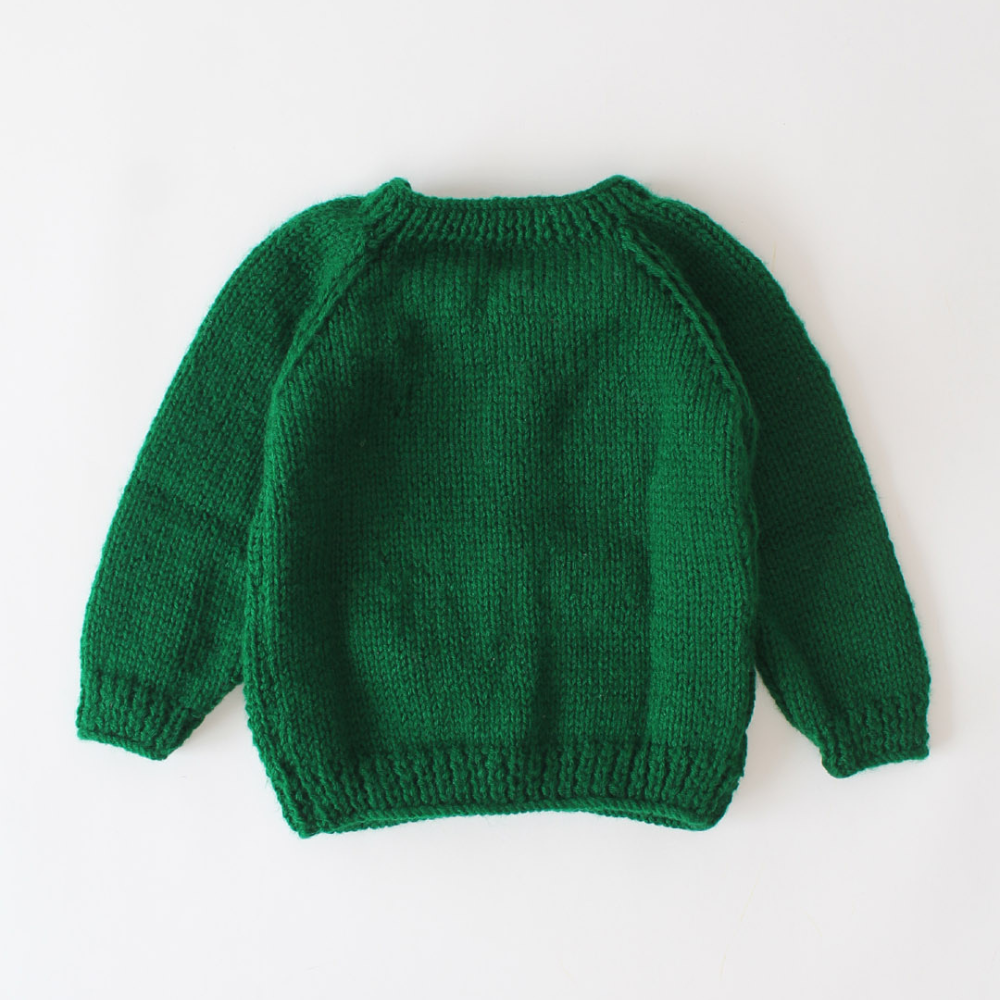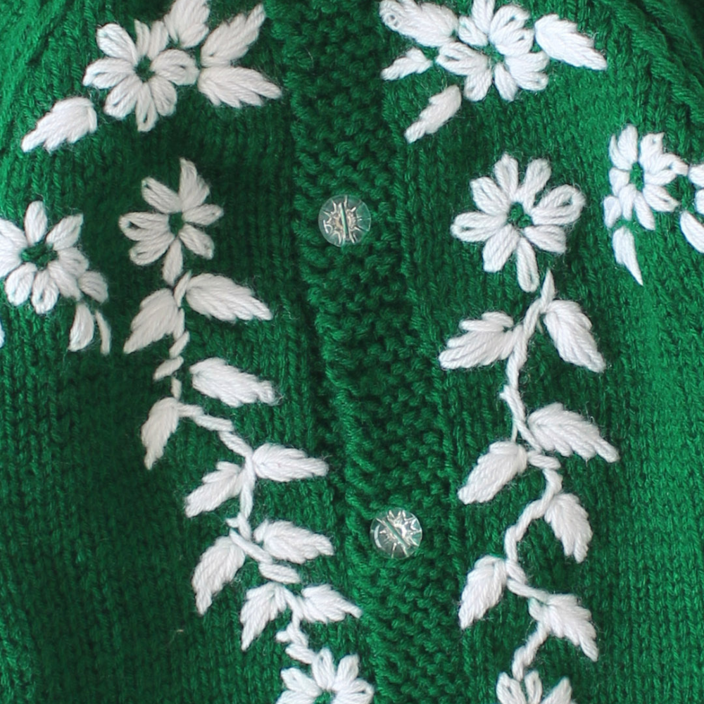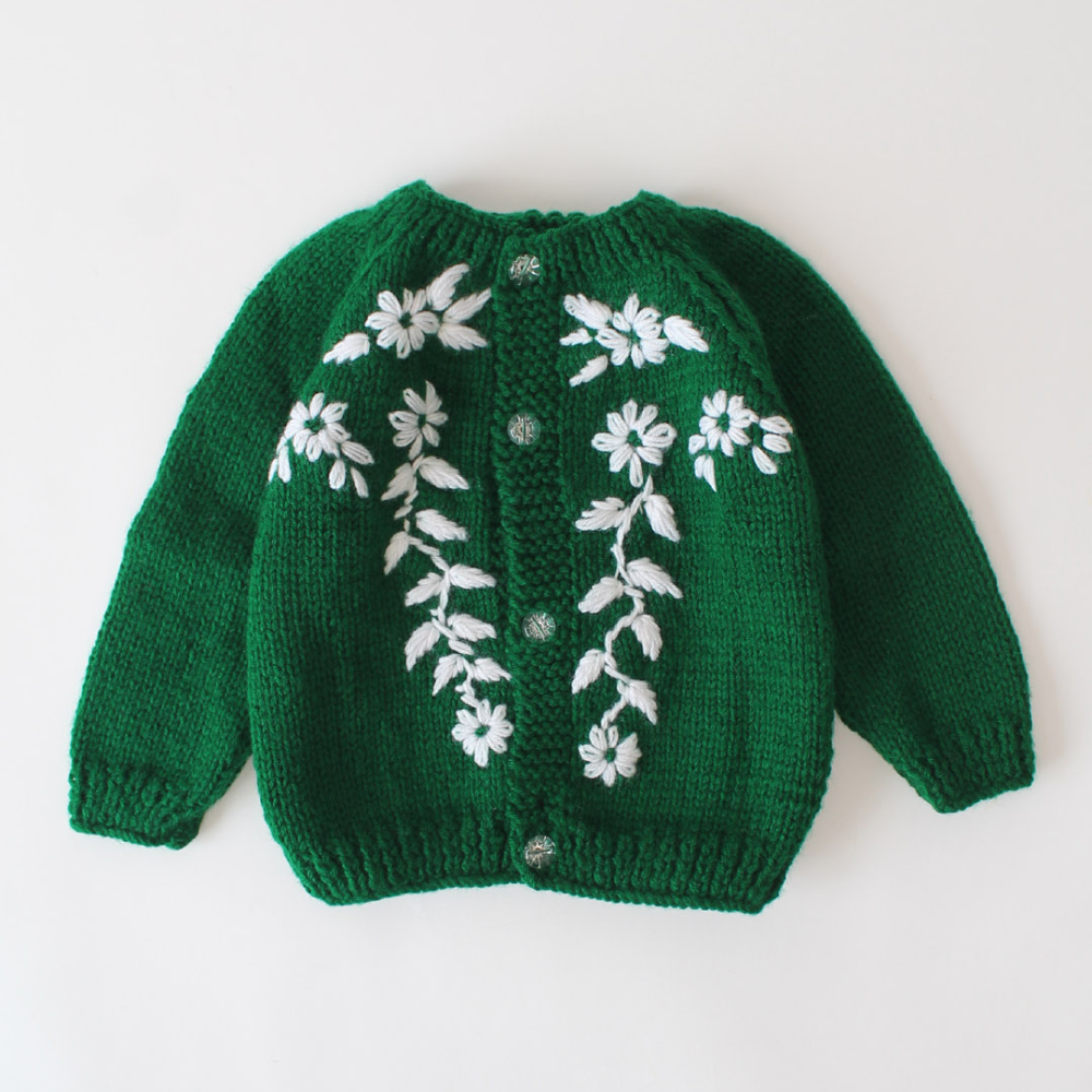 The sweater is a knitted garment with long sleeves.The flowers appear to be daisies, arranged in two vertical lines from shoulder to hem.Round neckline, front button fastening, ribbed cuffs, and waistband. This child-sized sweater combines cozy warmth with a touch of whimsy. Perfect for chilly days or simply appreciating handmade fashion. Color: It’s primarily green, adorned with white floral patterns. Style: It’s a cardigan with long sleeves. Pattern: Self Design Neck: Classic Round Crew Neck Closure: Button Dispatch Time - R