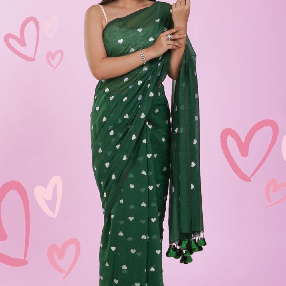 Dark Green Mul Cotton Saree with White Hearts