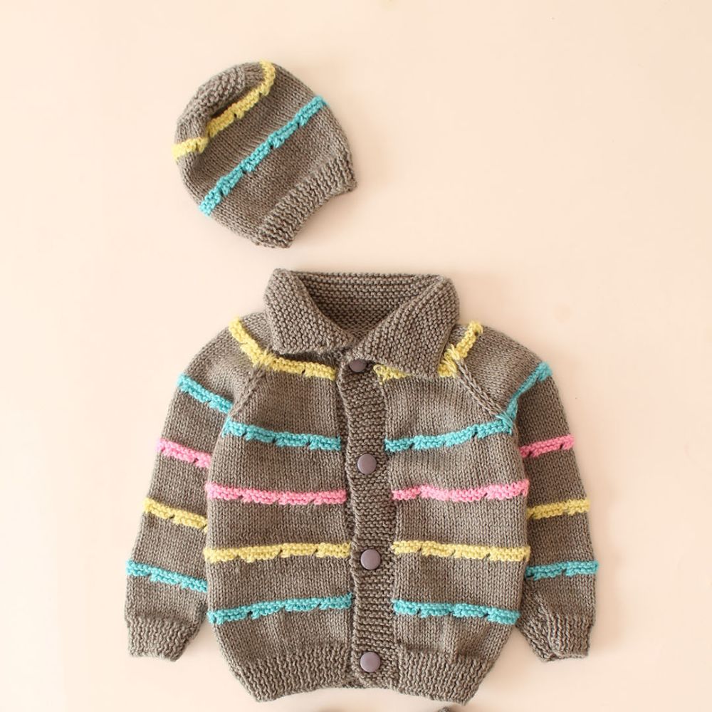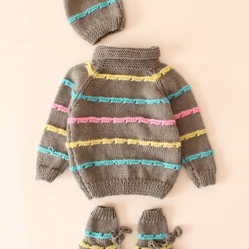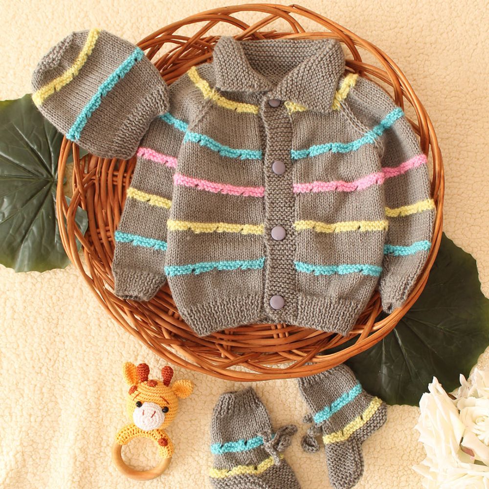 The knitted sweater is part of a set that includes a matching hat and booties. It features a shawl collar style neck, which drapes gracefully around the neckline. The sweater’s color palette is a delightful mix of gray, yellow, pink, and blue, arranged in horizontal stripes. The pattern showcases typical knit textures, with ribbed cuffs and collar. For closure, there are buttons down the front.
