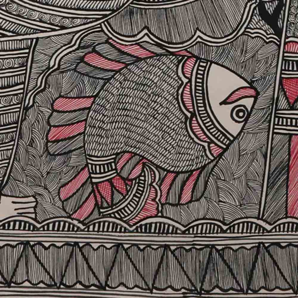 Immerse yourself in the celestial romance of Lord Krishna and Radha with our exquisite Madhubani painting, meticulously handcrafted by skilled artisans from the Mithila region of India. This enchanting artwork captures the eternal love and divine bond shared between Krishna, the playful and enchanting deity, and Radha, his beloved consort and eternal devotee.rnrnIn this intricately detailed composit