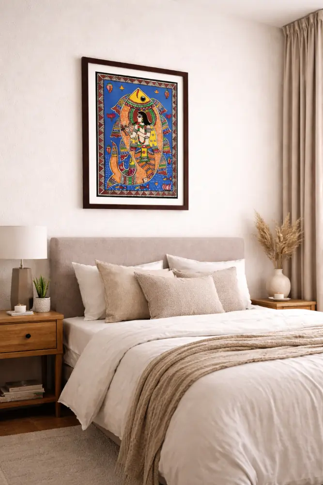 This exquisite Madhubani painting captures the divine essence of Lord Krishna through intricate patterns and vivid natural colors. Handmade by skilled artisans, the artwork reflects the rich storytelling tradition of Indian folk art, making it a meaningful addition to spiritual spaces and elegant home décor.