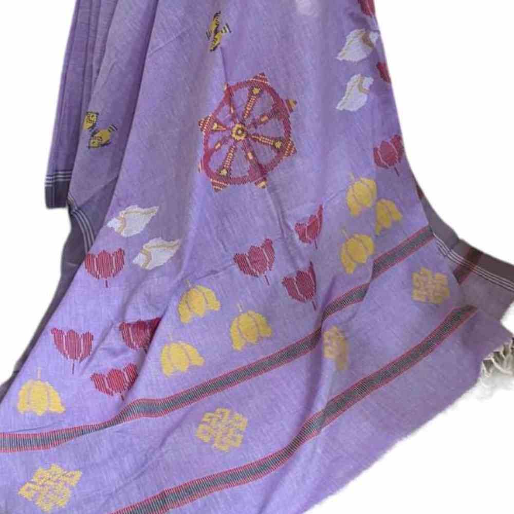 The Divine Lotus Bawan Buti Saree is a sublime piece that beautifully embodies the essence of traditional artistry and spirituality, intricately handwoven by skilled artisans from Bihar. Featuring a serene lavender base adorned with exquisite lotus motifs, this saree symbolizes purity and divine beauty, making it an ideal choice for special occasions.