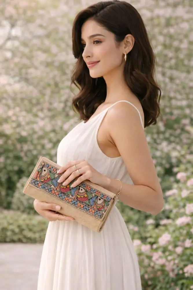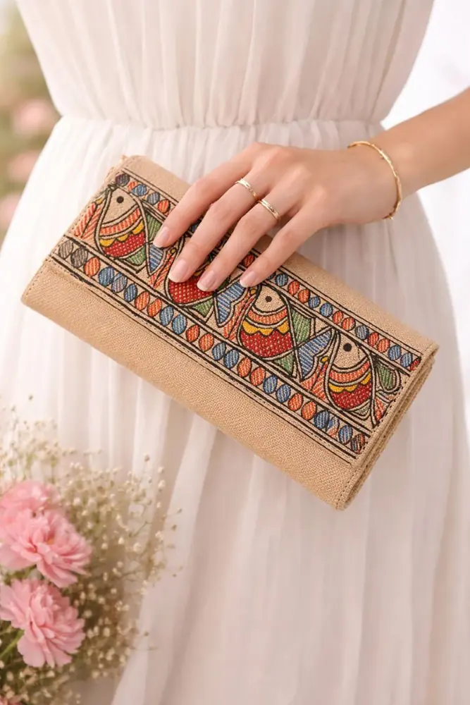 This handcrafted jute handbag is thoughtfully made by skilled artisans using natural jute fabric and hand-painted folk-inspired motifs. The natural beige base is beautifully highlighted with colourful fish patterns symbolising abundance and harmony. Designed for elegance and utility, this handbag adds a handcrafted statement to both everyday and festive looks.