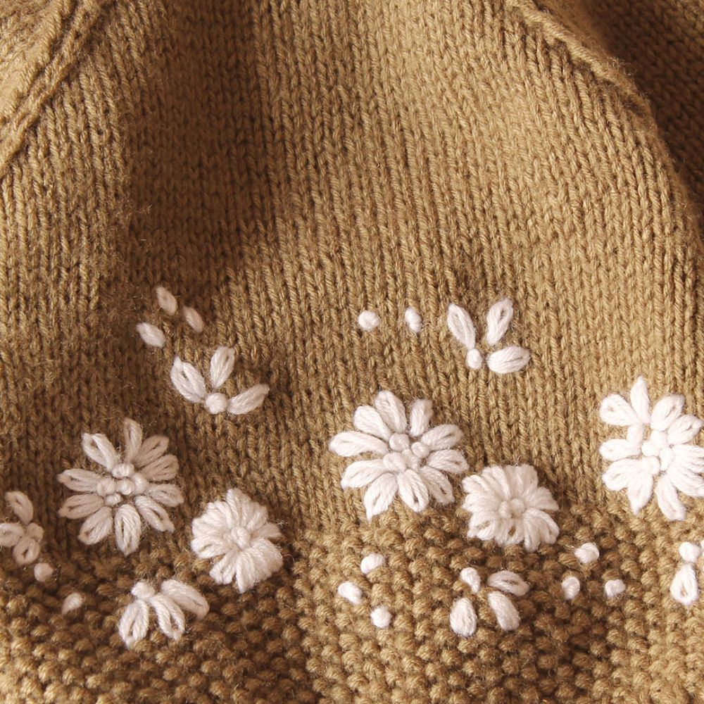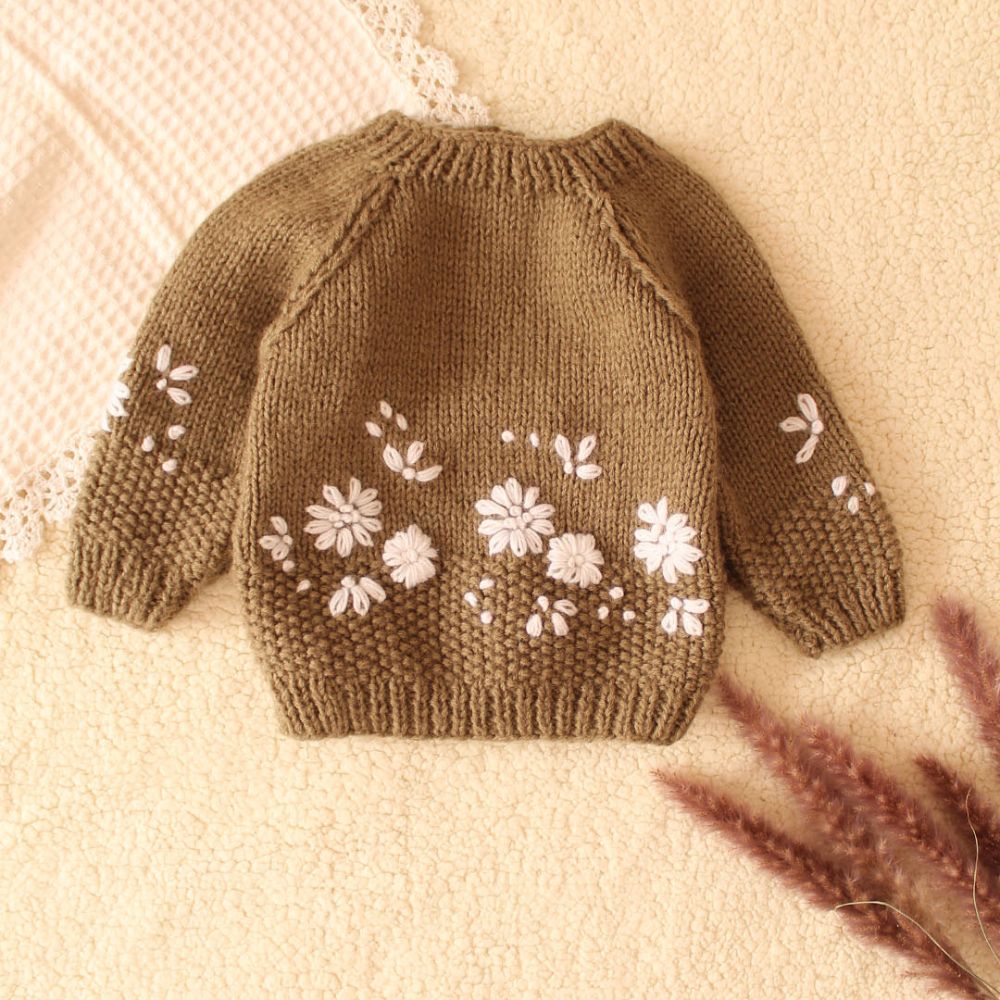 Color: The sweater is a lovely earthy brown, providing a neutral backdrop for the striking white floral motifs.
