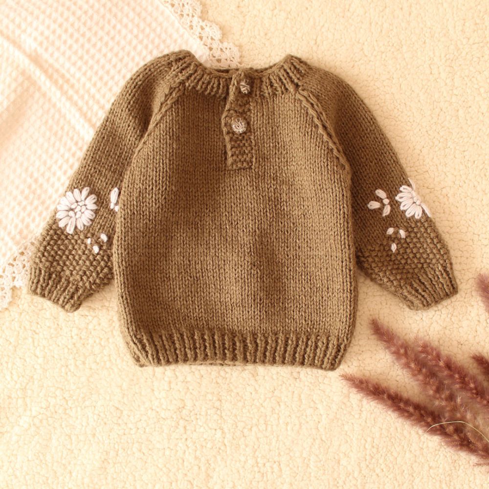Closure: There are no visible closures; it seems to be a pullover style. Crafted with care, each sweater is 100% handmade, ensuring the highest quality for your little ones. Our commitment to sustainability shines through in every aspect of production, from sourcing materials to crafting techniques. We use Azo-free dyes, keeping your child's skin and the environment safe. But it's not just about being eco-conscious – our sweaters boast playful designs that spark joy and creativity in children. Plus, every purchase supports rural artisans, empowering communities and preserving traditional craftsmanship. Available in 8 age groups, from newborns to 5-year-olds, Woonie Kids Sweaters are a must-have for every growing adventurer.