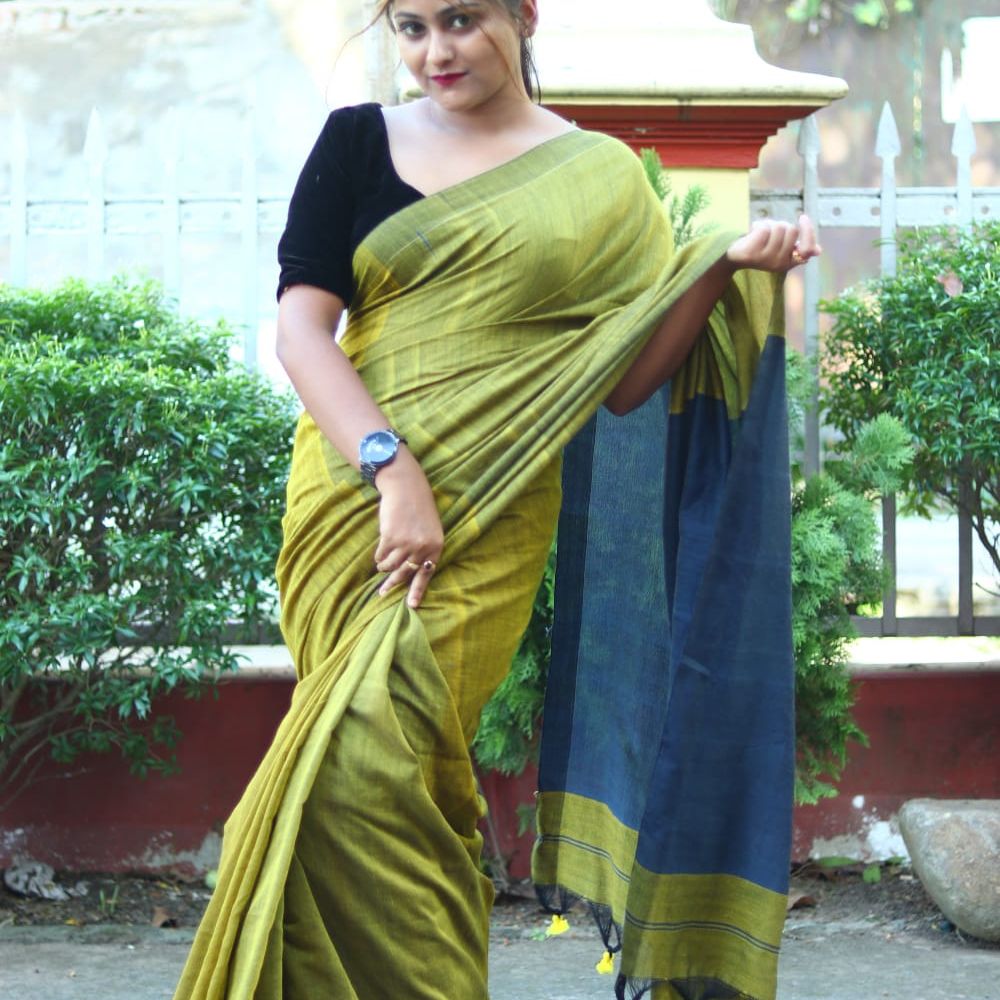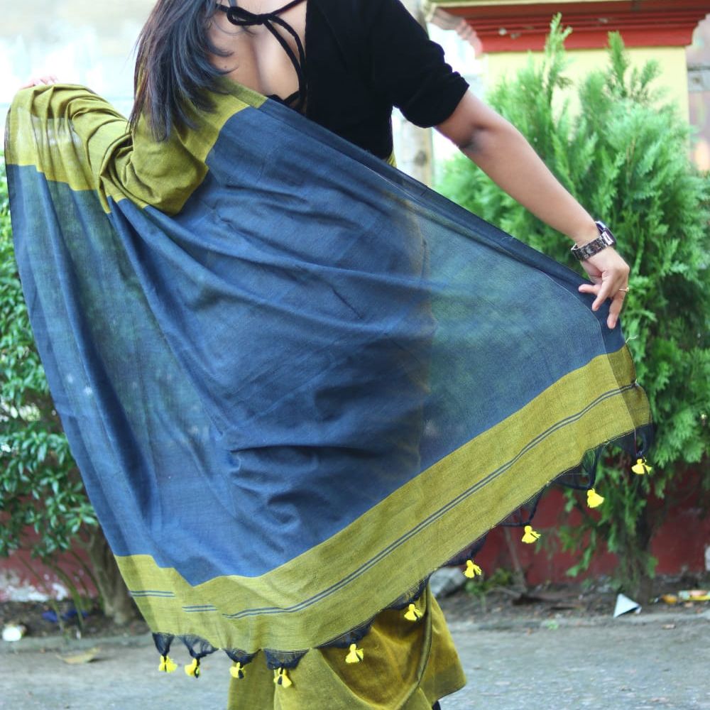 This lightweight and breathable cotton saree features a soothing olive green body complemented by a navy blue pallu with a subtle golden border. Perfect for everyday elegance or casual outings, its simplicity speaks volumes. The saree is handwoven by skilled artisans, ensuring a rich texture and exceptional quality. Pair it with minimal jewelry and a blouse of your choice to complete the look.