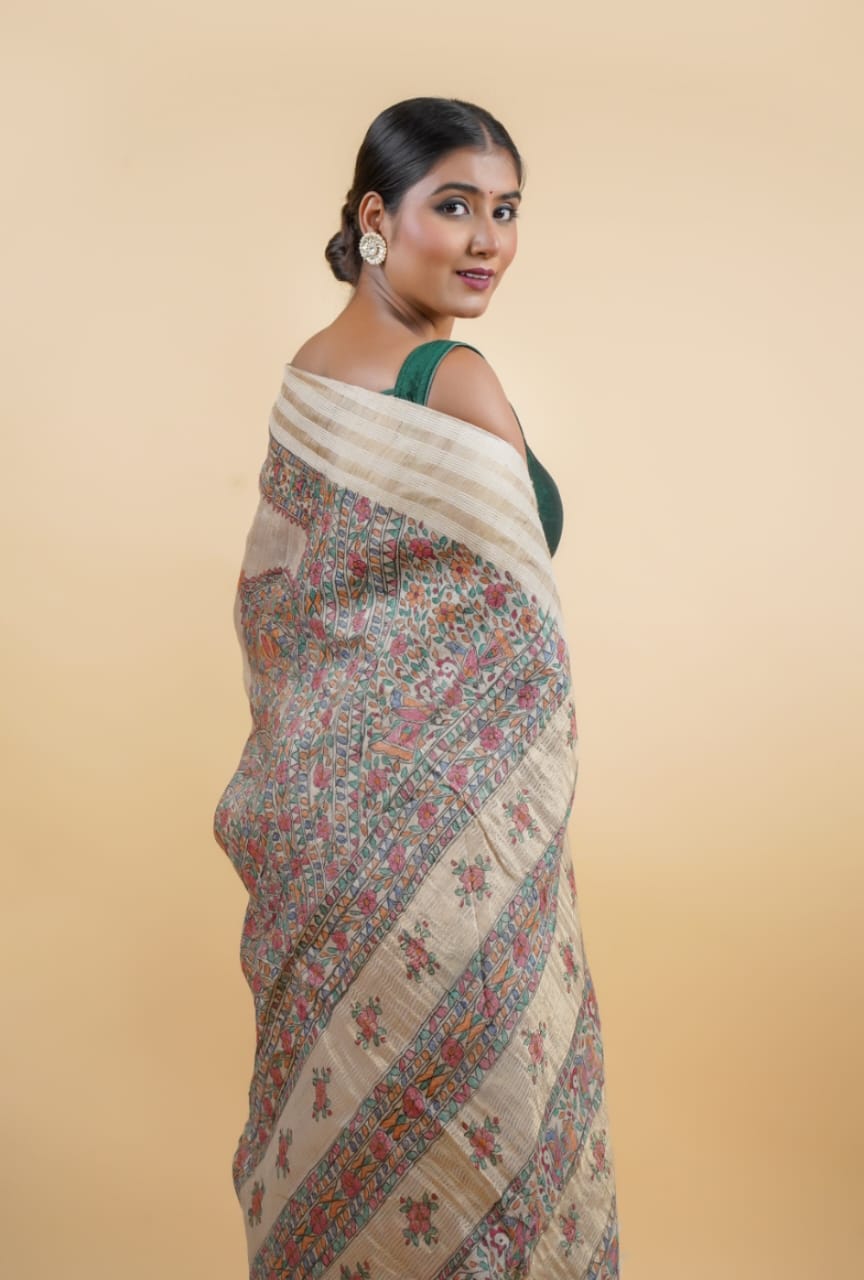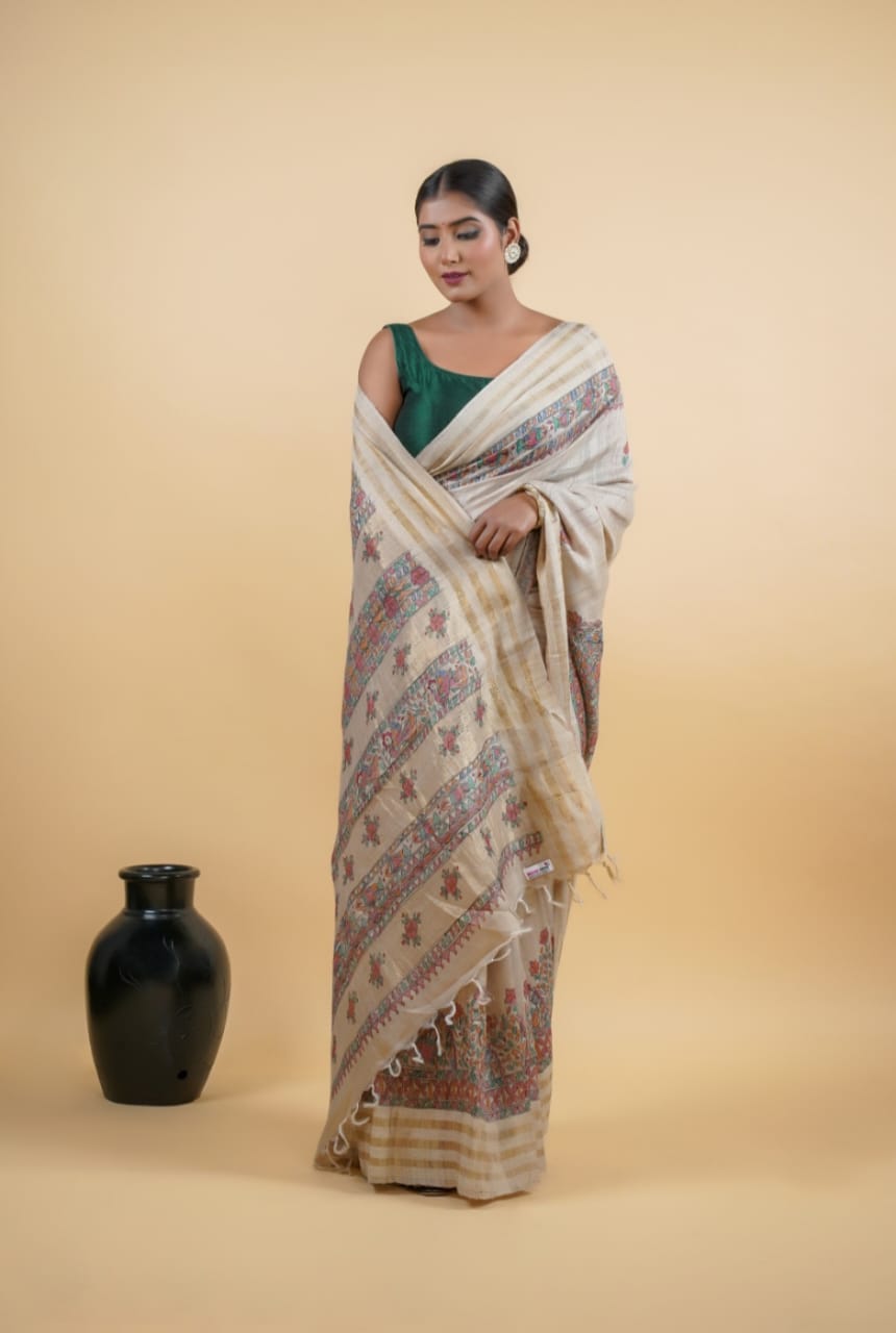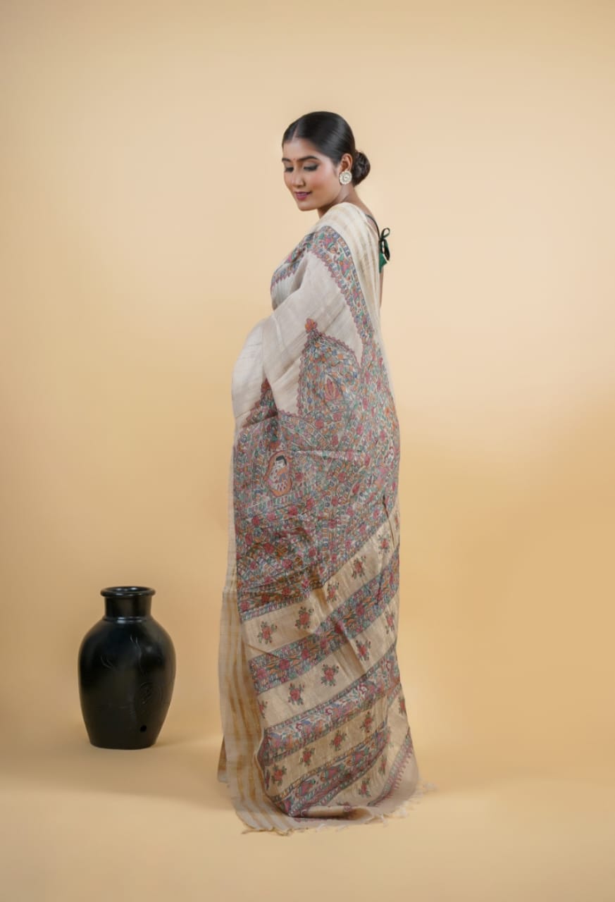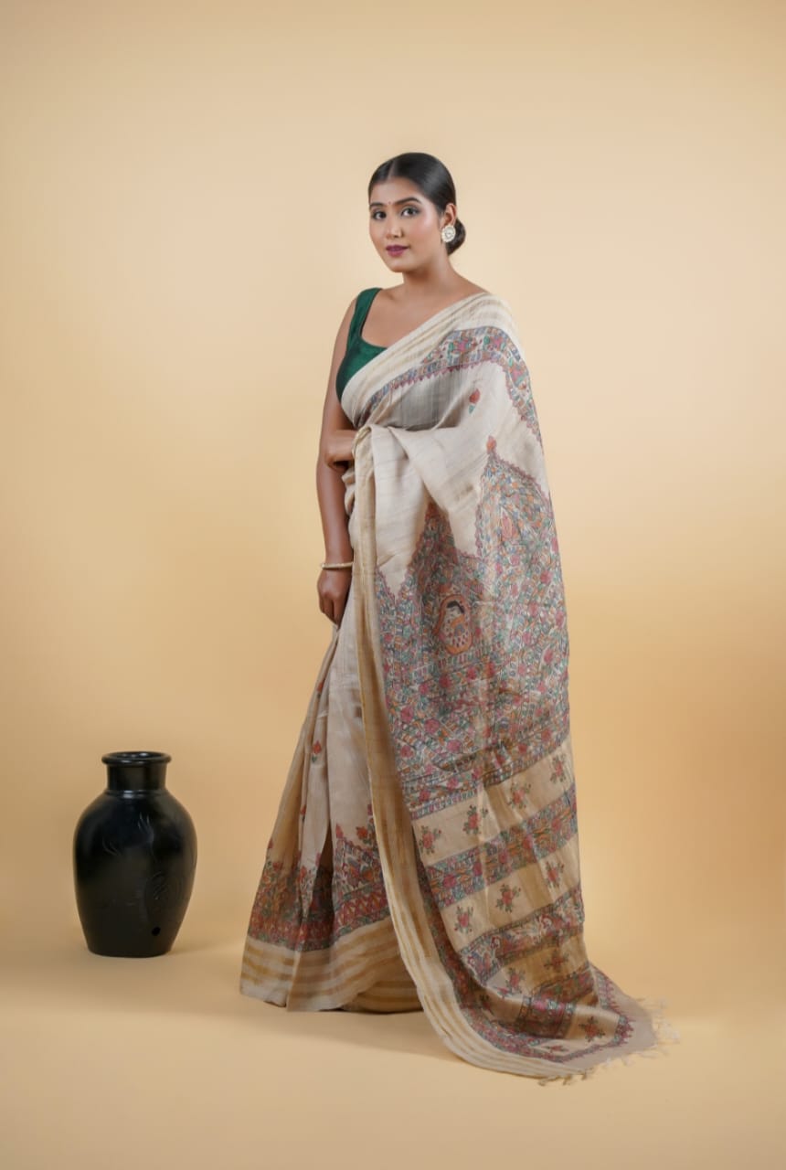 Elegant Pure Tussar Ghicha Silk Saree with Madhubani painting