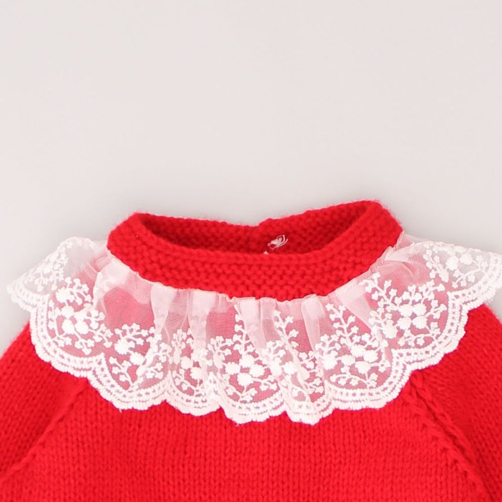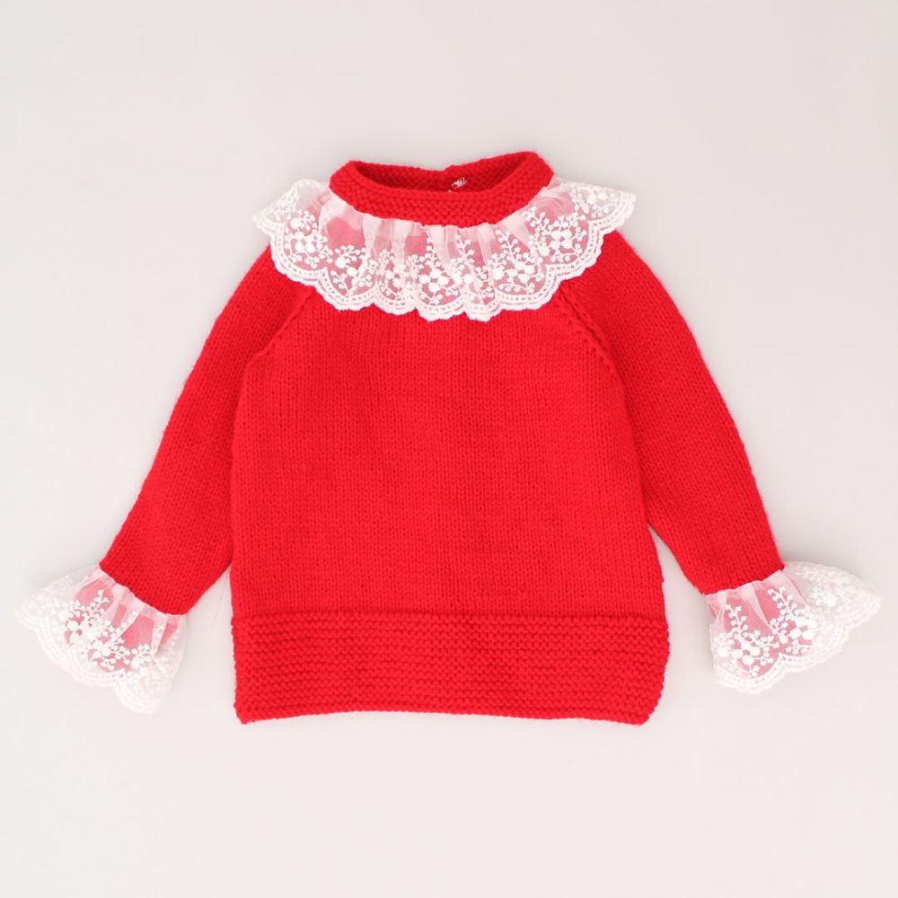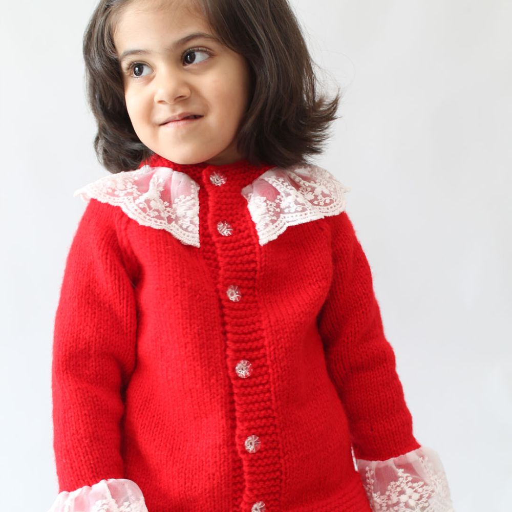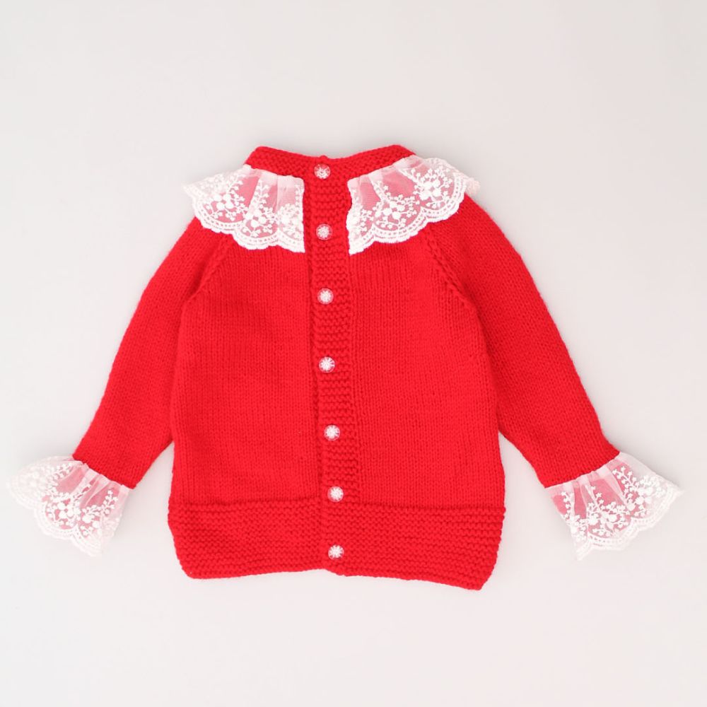 Design: The design combines classic and playful elements. Notably, there’s an ornate white lace collar that adds elegance and contrast to the bold red.Notably, there’s delicate white lace trim adorning the collar and cuffs, adding an elegant touch.Overall, this red sweater strikes a balance between timeless elegance and contemporary flair. The lace accents and button closure make it a standout piece for any wardrobe.
