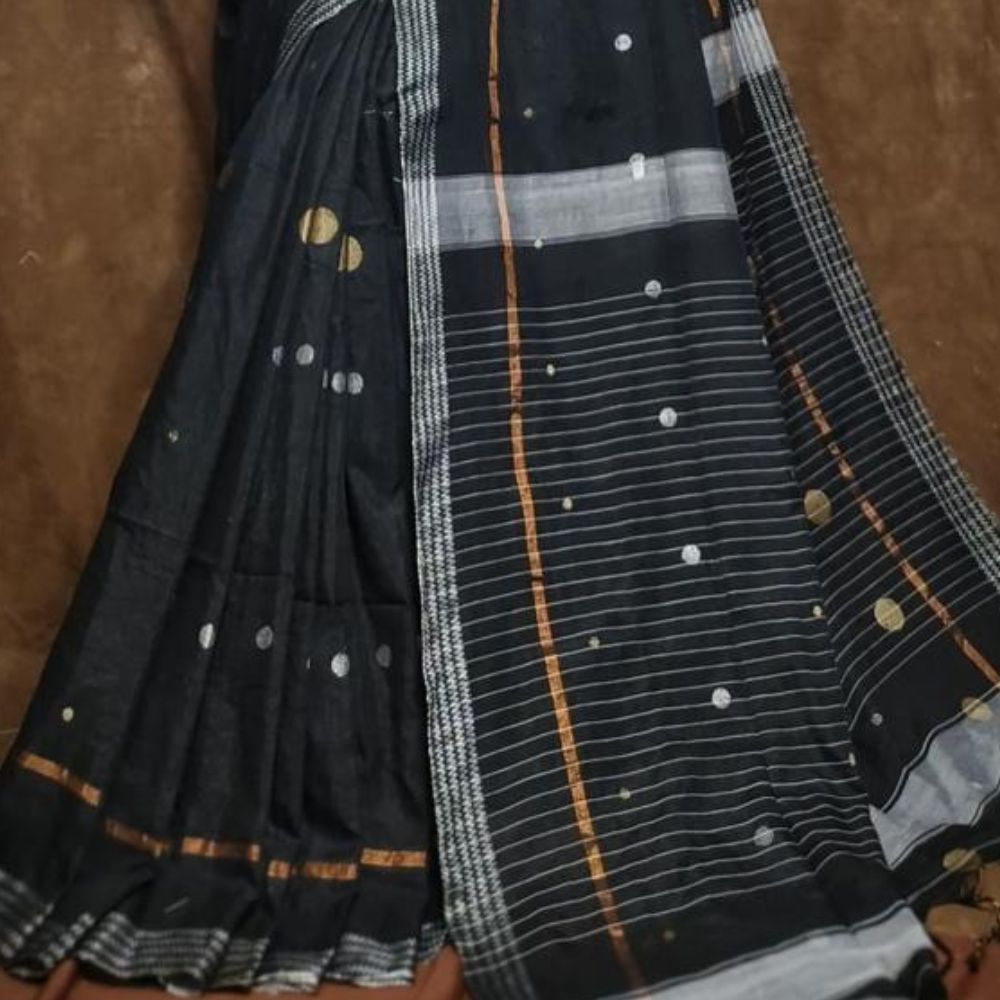 Step into the world of timeless elegance with this captivating Tissue Silk Jamdani saree in a striking black hue. Designed for the modern woman who cherishes tradition, this saree is a masterpiece of fine craftsmanship and artistic allure.