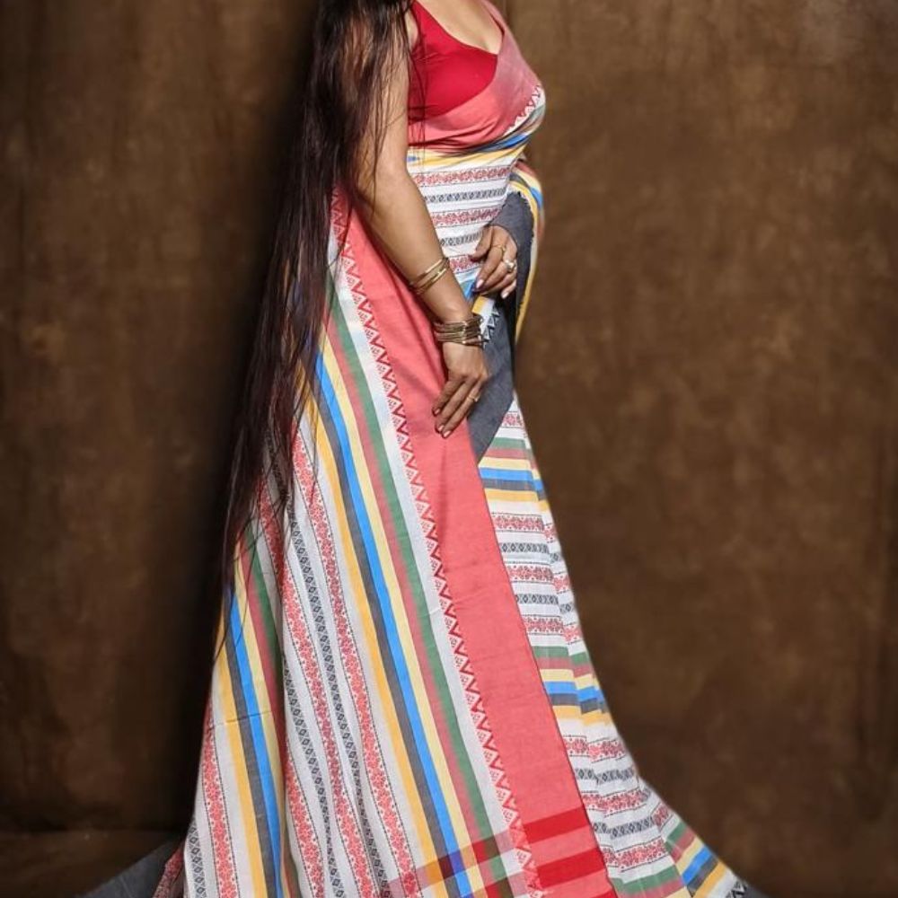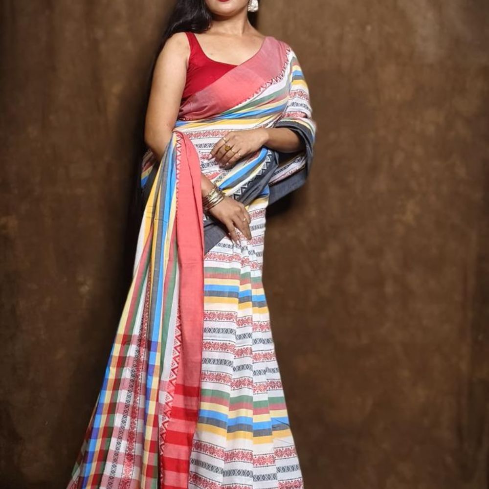 Celebrate vibrancy and tradition with this stunning multicolored saree, a visual delight crafted for the modern yet culturally rooted woman. The saree features a striking combination of bold stripes in vibrant hues like red, yellow, green, and blue, beautifully harmonized with intricate geometric patterns that reflect heritage artistry.