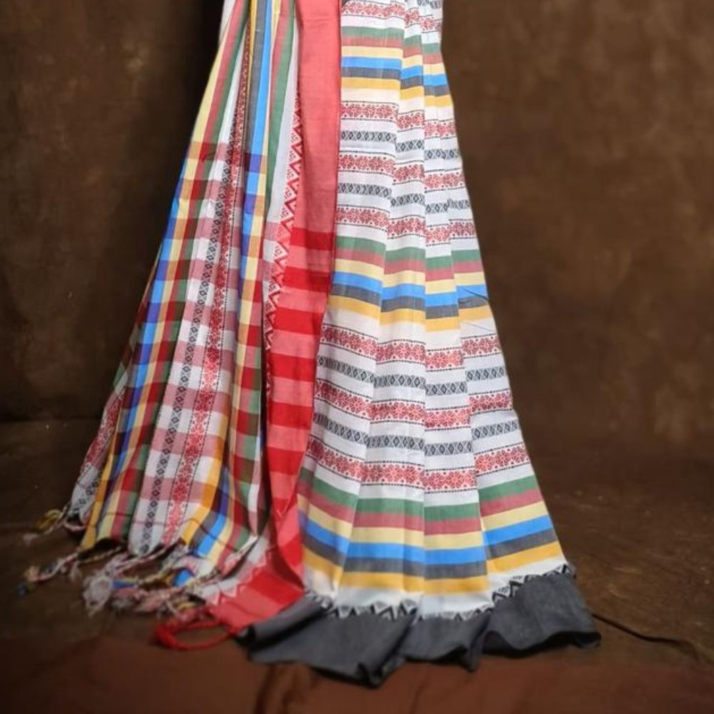 Vibrant Multicolored Handwoven Saree with Striped and Geometric Patterns