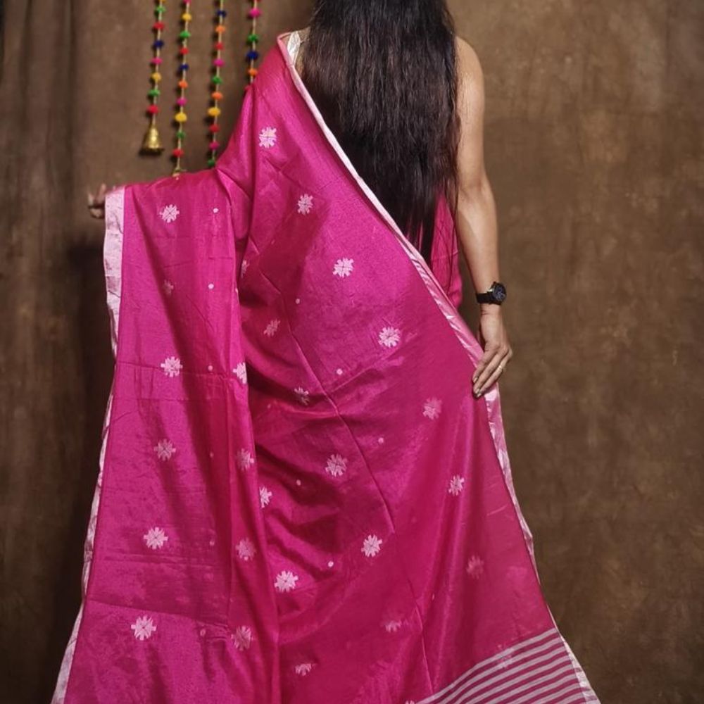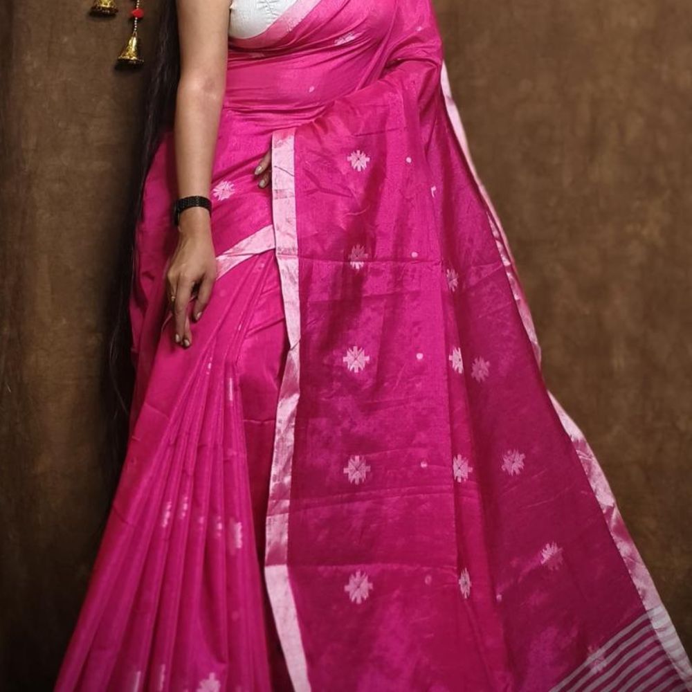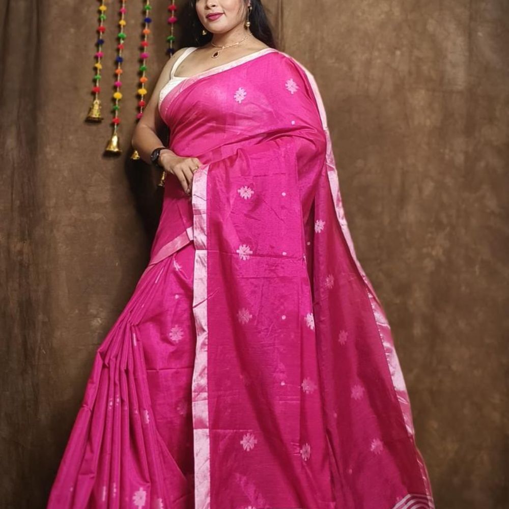 The soft pink hue exudes femininity and elegance, making it ideal for weddings, festive celebrations, or traditional ceremonies. The intricate detailing along the borders, as well as the delicate Jamdani motifs, create a perfect balance between classic and contemporary styles. Its light and breathable fabric ensures comfort and ease of movement, so you can wear it for extended periods without compromising on style.