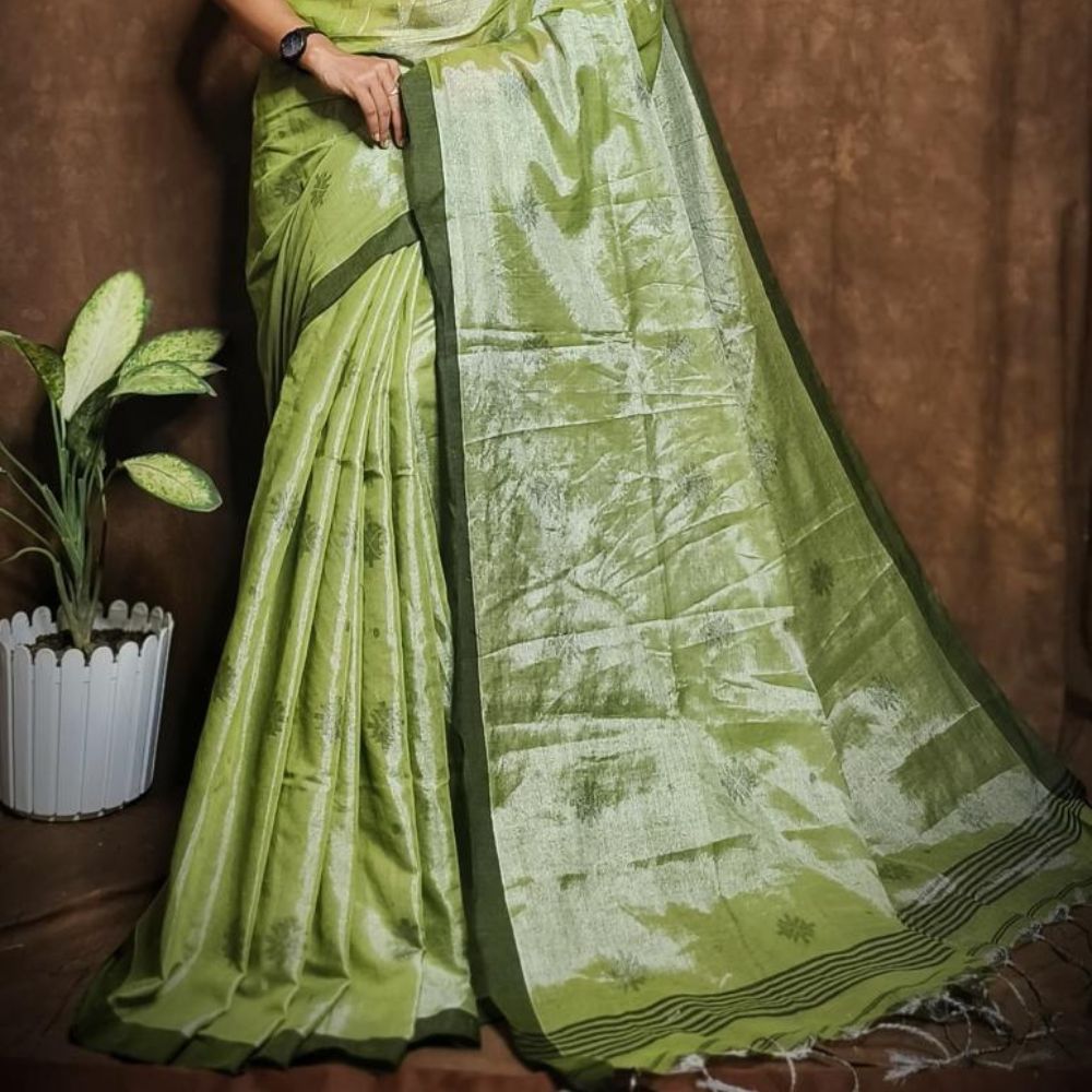 This elegant light green Tissue Silk Jamdani saree is a perfect blend of traditional craftsmanship and modern elegance. Handwoven using premium tissue silk, the saree features intricate Jamdani weaving, a technique known for its delicate, artistic patterns. The soft texture of the fabric ensures a graceful drape, offering both comfort and style. The light green color exudes a fresh, serene appeal, making it ideal for weddings, festivals, and formal occasions.