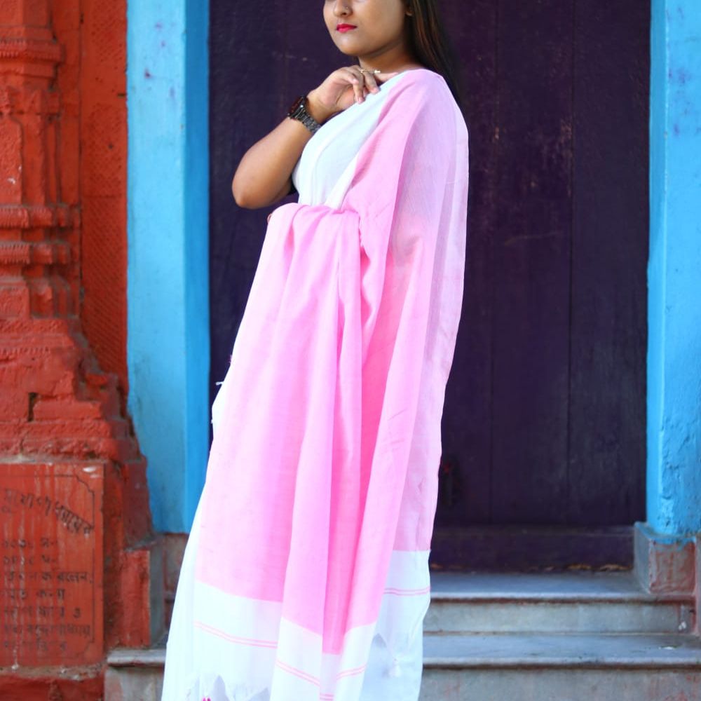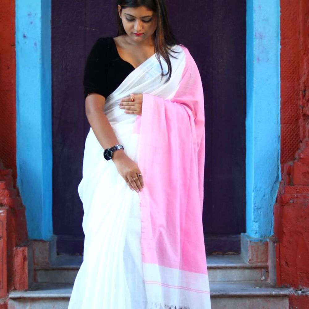 This graceful white saree, paired with a vibrant pink aanchal, is a timeless piece that embodies simplicity and charm. The plain white body lends a sophisticated look, while the bright pink aanchal adds a pop of color, making it perfect for festive celebrations, casual gatherings, or even office wear. Handwoven with care, this saree offers a soft and breathable texture, ensuring all-day comfort.