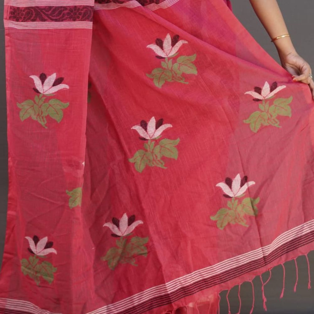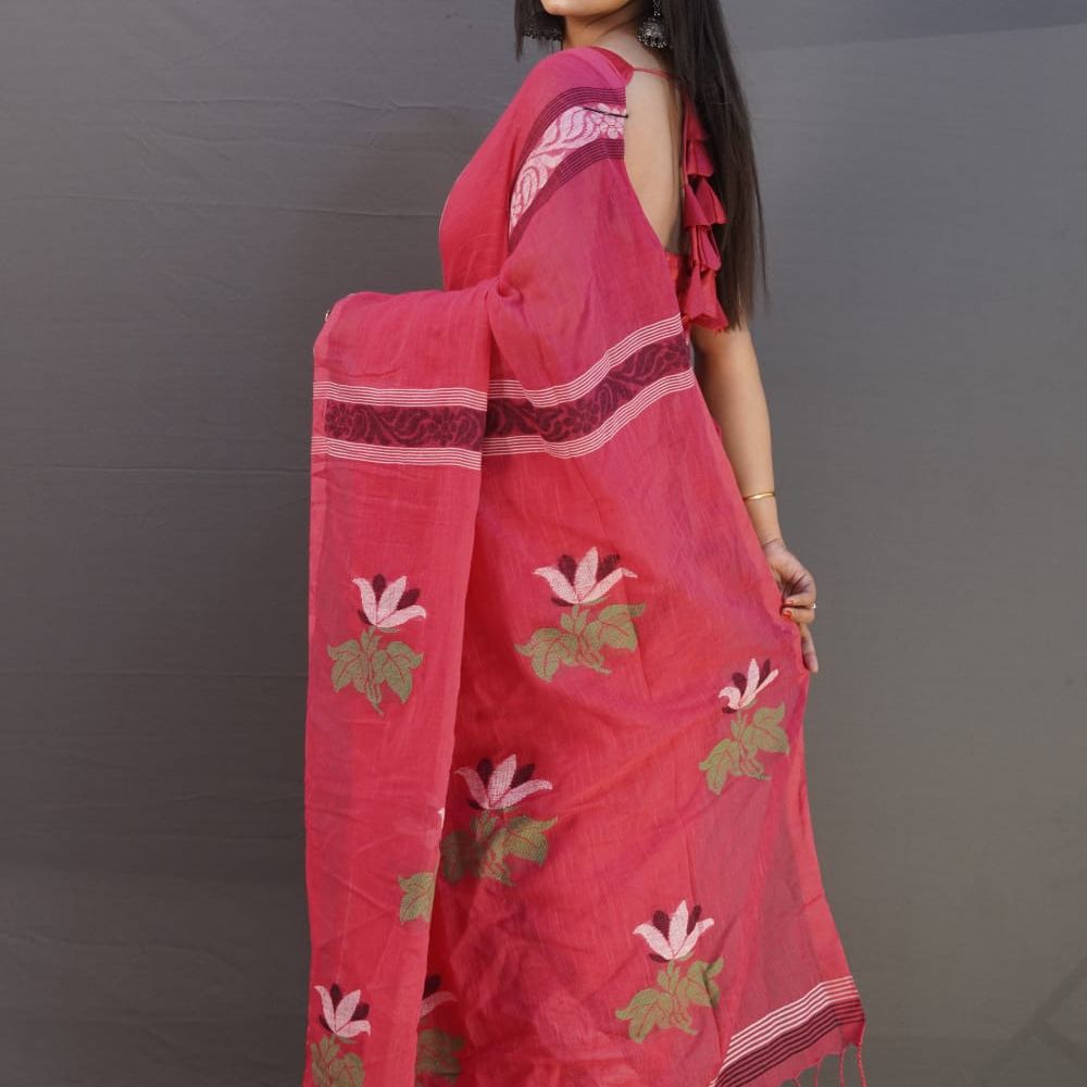 Step into elegance with our Elegant Linen Jamdani Saree in a beautiful gajri (pink) hue. This saree, handwoven from premium linen, offers a perfect balance of softness and sophistication. Adorned with exquisite floral motifs in shades of green, white, and red, this saree showcases the timeless beauty of the Jamdani weaving tradition.